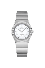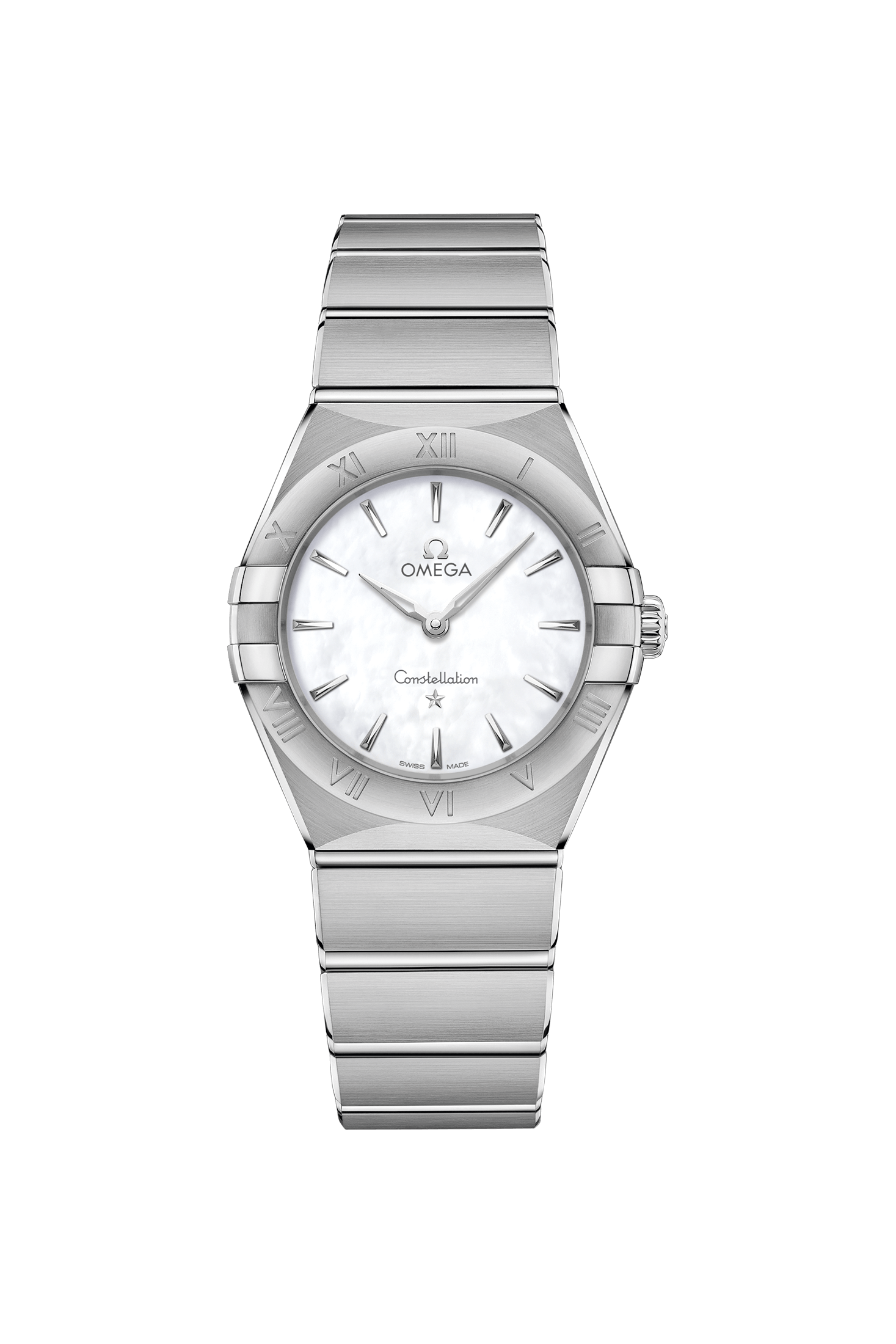 この28mmのステンレススティール製モデルは、ローマ数字が刻印されたベゼルが印象的で、ホワイトマザーオブパールのダイアルと傷の付きにくいサファイアクリスタルガラスが採用されています。針、オメガロゴ、コンステレーションの「星」、インデックスには18Kホワイトゴールドが使用されています。