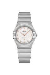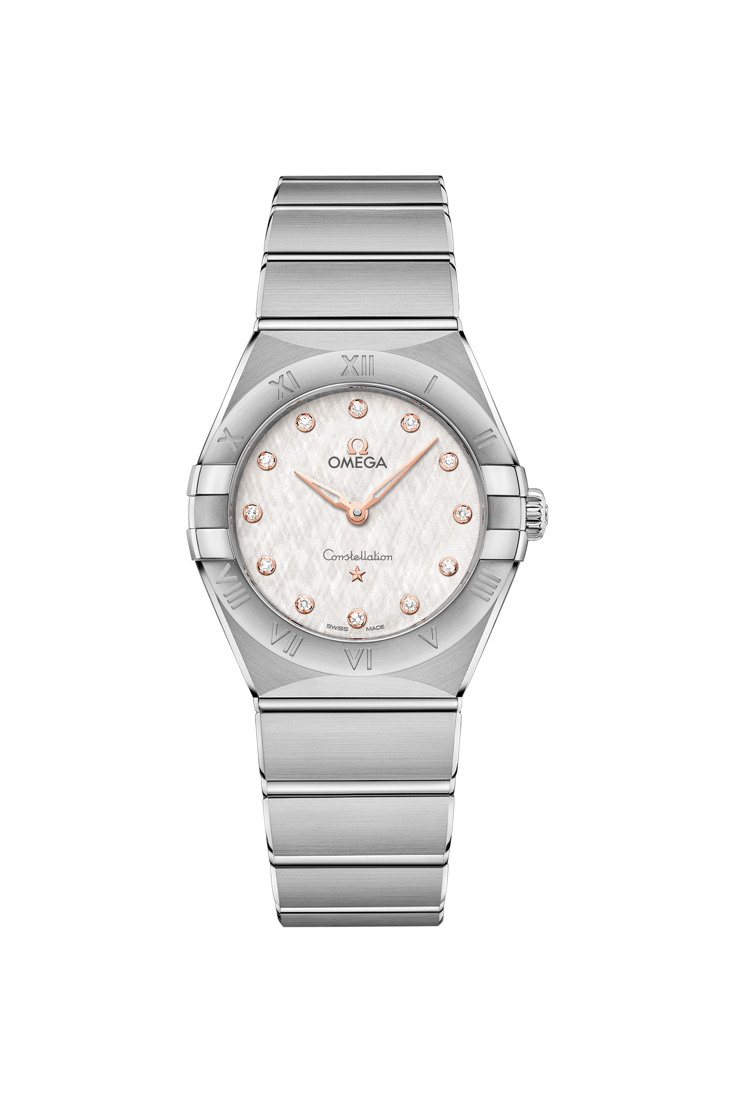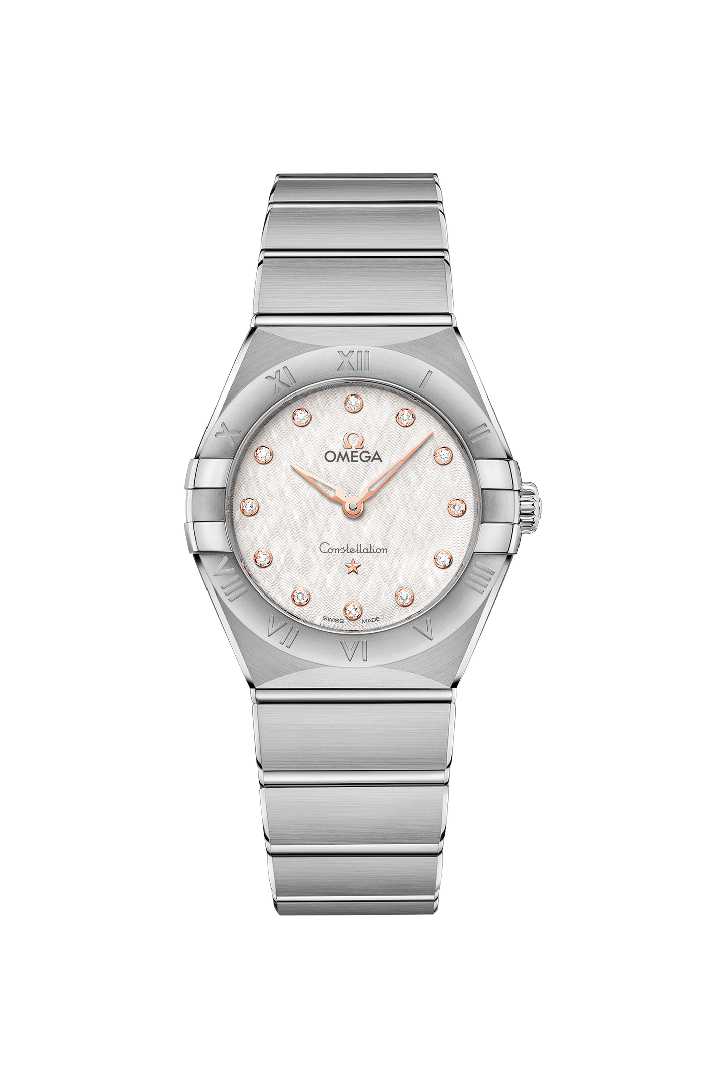 この28mmのステンレススティール製モデルは、ローマ数字が刻印されたベゼルが印象的で、シルク生地にみられるクロス模様のパターンが施されたクリームシルバーダイアルと傷の付きにくいサファイアクリスタルガラスが採用されています。針、オメガロゴ、コンステレーションの「星」、ダイヤモンドインデックスのベゼルには18Kセドナ™ ゴールドが使用されています。