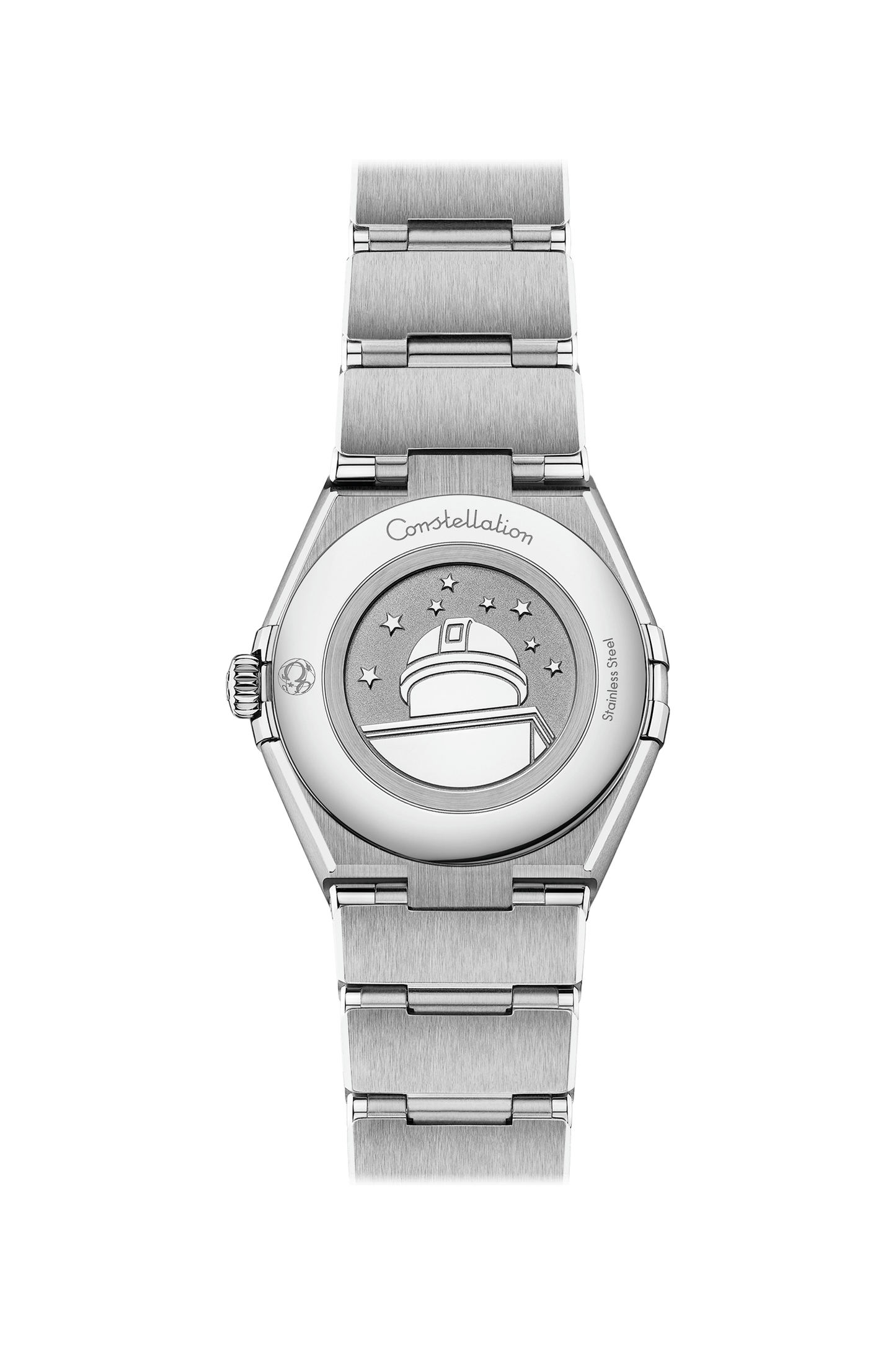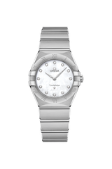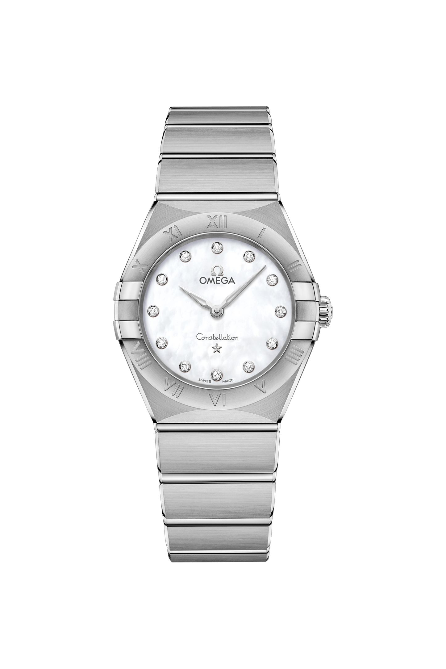この28mmのステンレススティール製モデルは、ローマ数字が刻印されたベゼルが印象的で、ホワイトマザーオブパールのダイアルには、ダイヤモンドのインデックスが配され、傷の付きにくいサファイアクリスタルガラスが採用されています。針、オメガロゴ、コンステレーションの「星」、ダイヤモンドインデックスのベゼルにも18Kホワイトゴールドが使用されています。