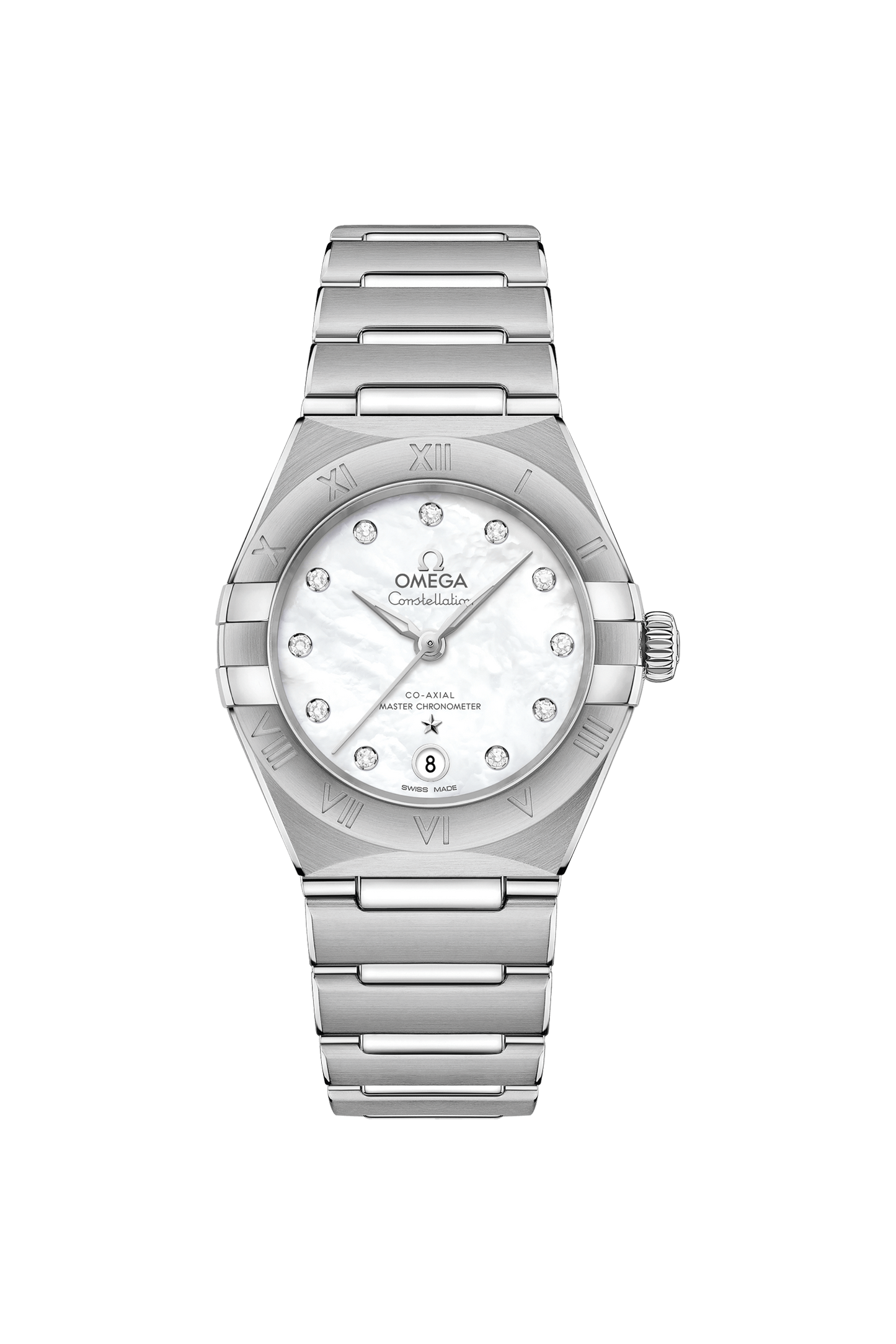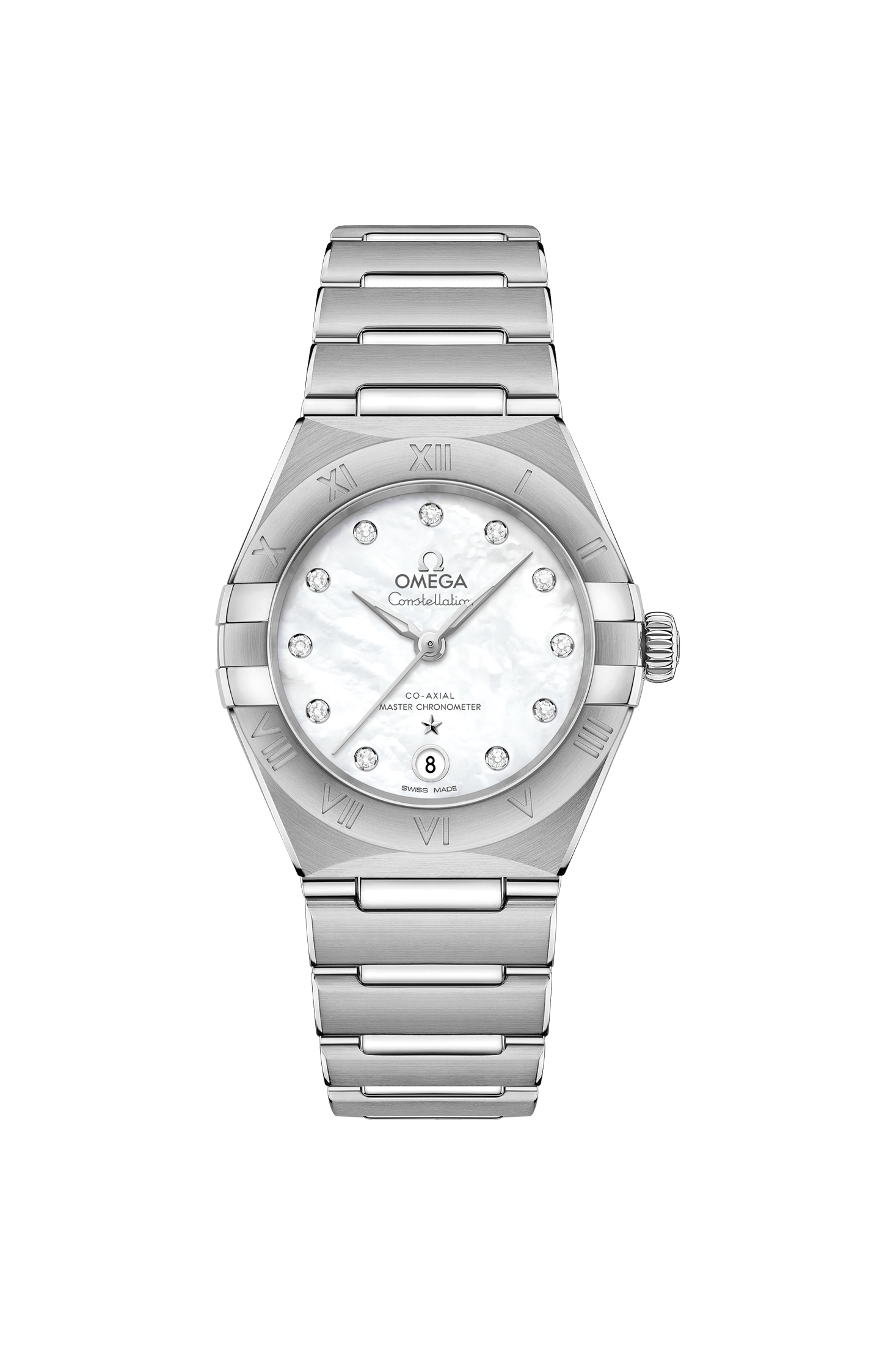 この29mmのステンレススティール製モデルは、ローマ数字が刻印されたベゼルが印象的で、マザーオブパールのダイアルには、ダイヤモンドのインデックスと、6時位置に日付窓があります。針、オメガロゴ、コンステレーションの「星」、ダイヤモンドインデックスのベゼルには18Kホワイトゴールドが使用されています。