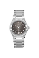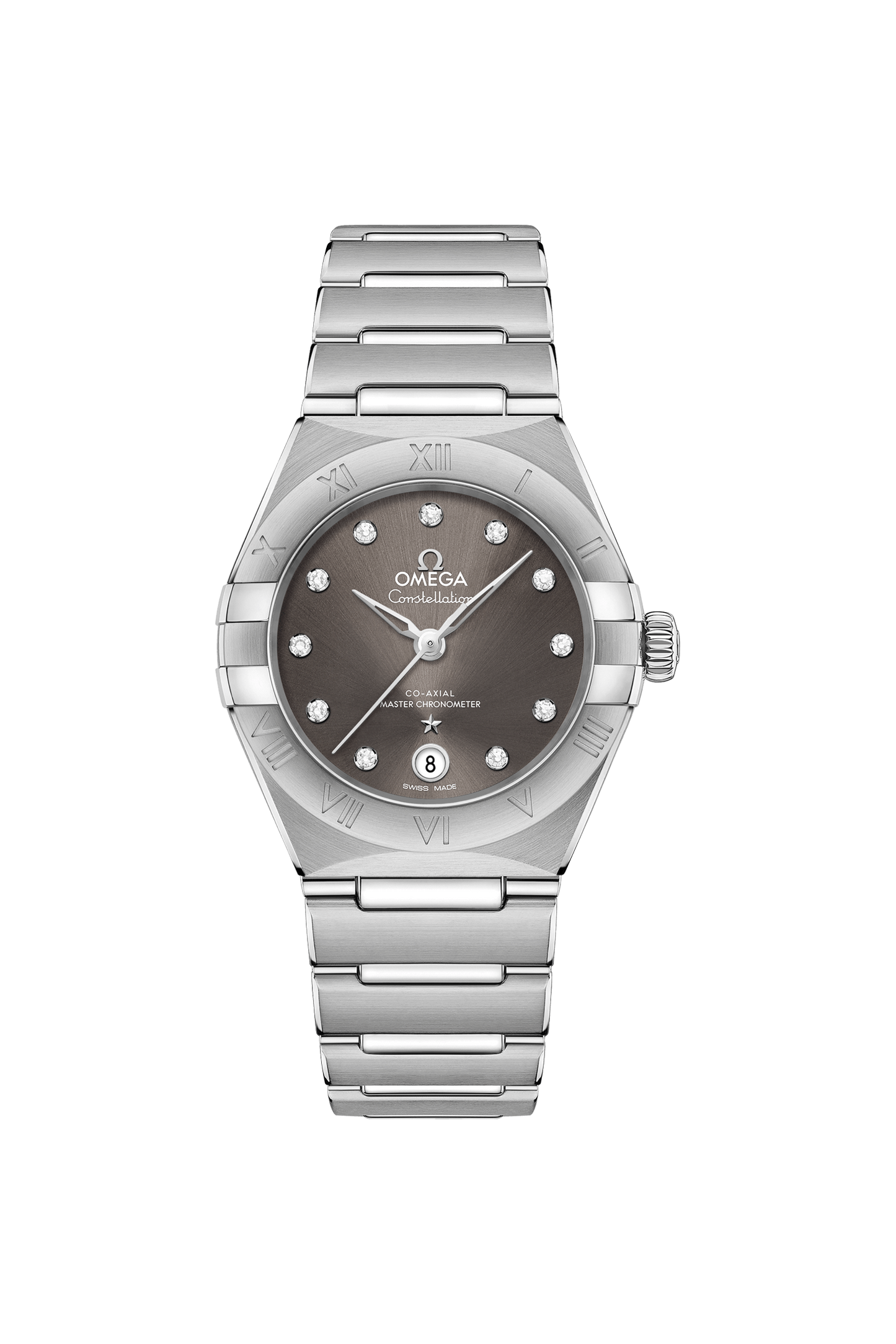 この29mmのステンレススティール製モデルは、ローマ数字が刻印されたベゼルが印象的で、サンブラッシュ仕上げのグレーダイアルには、ダイヤモンドのインデックスと、6時位置に日付窓があります。針、オメガロゴ、コンステレーションの「星」、ダイヤモンドインデックスのベゼルには18Kホワイトゴールドが使用されています。