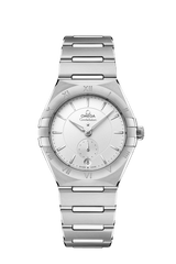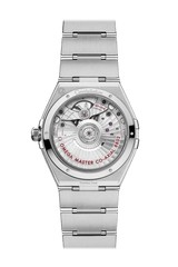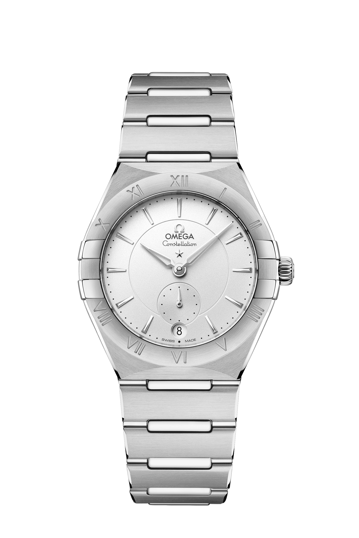 34mmのステンレススティール製モデルは、ベゼルにローマ数字を刻印。クリスタルホワイトシルバーのダイアルには、6時位置にラウンドシェイプの日付窓が備えられています。ポリッシュ仕上げのアワーマーカー、針、オメガロゴ、コンステレーションの「星」はいずれも18Kホワイトゴールド製で、スモールセコンドのサブダイアルと中央のミニッツトラックはリングで囲われたデザインです。