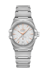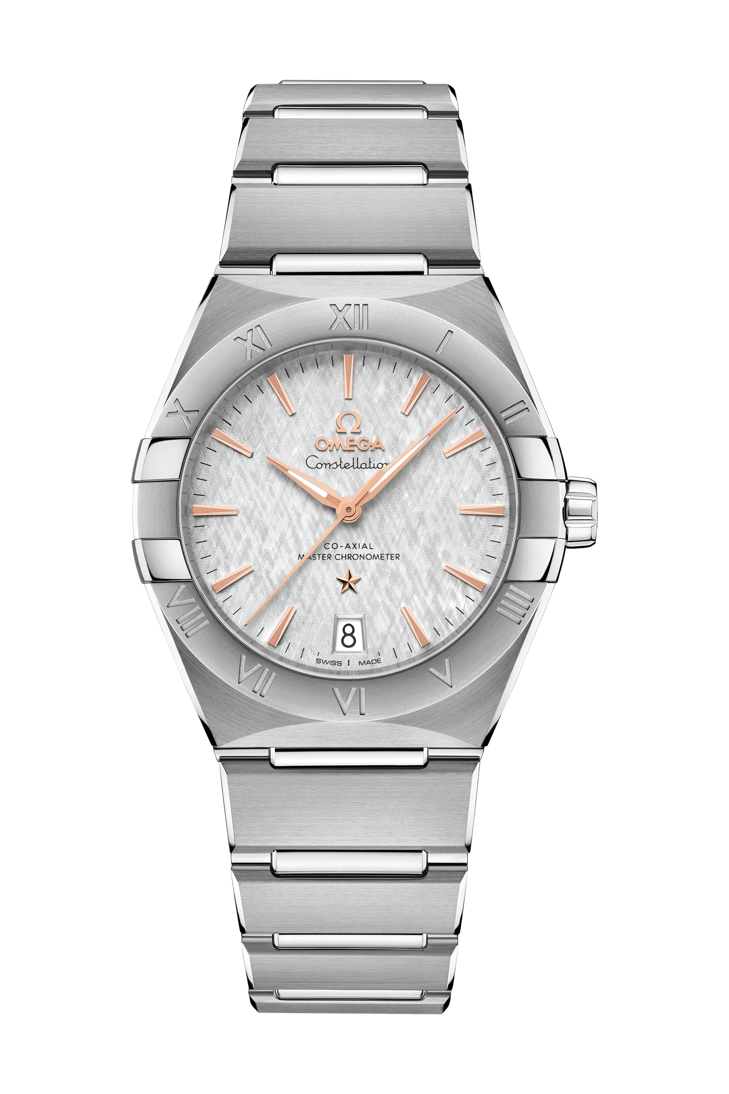 この36 mmのステンレススティール製モデルは、ローマ数字が刻印されたベゼルが印象的で、シルクエンボス加工のロジウム製グレーダイアルには、6時位置に日付窓があります。針、オメガロゴ、コンステレーションの「星」、インデックスにはいずれも18Kセドナ™ ゴールドが使用されています。