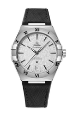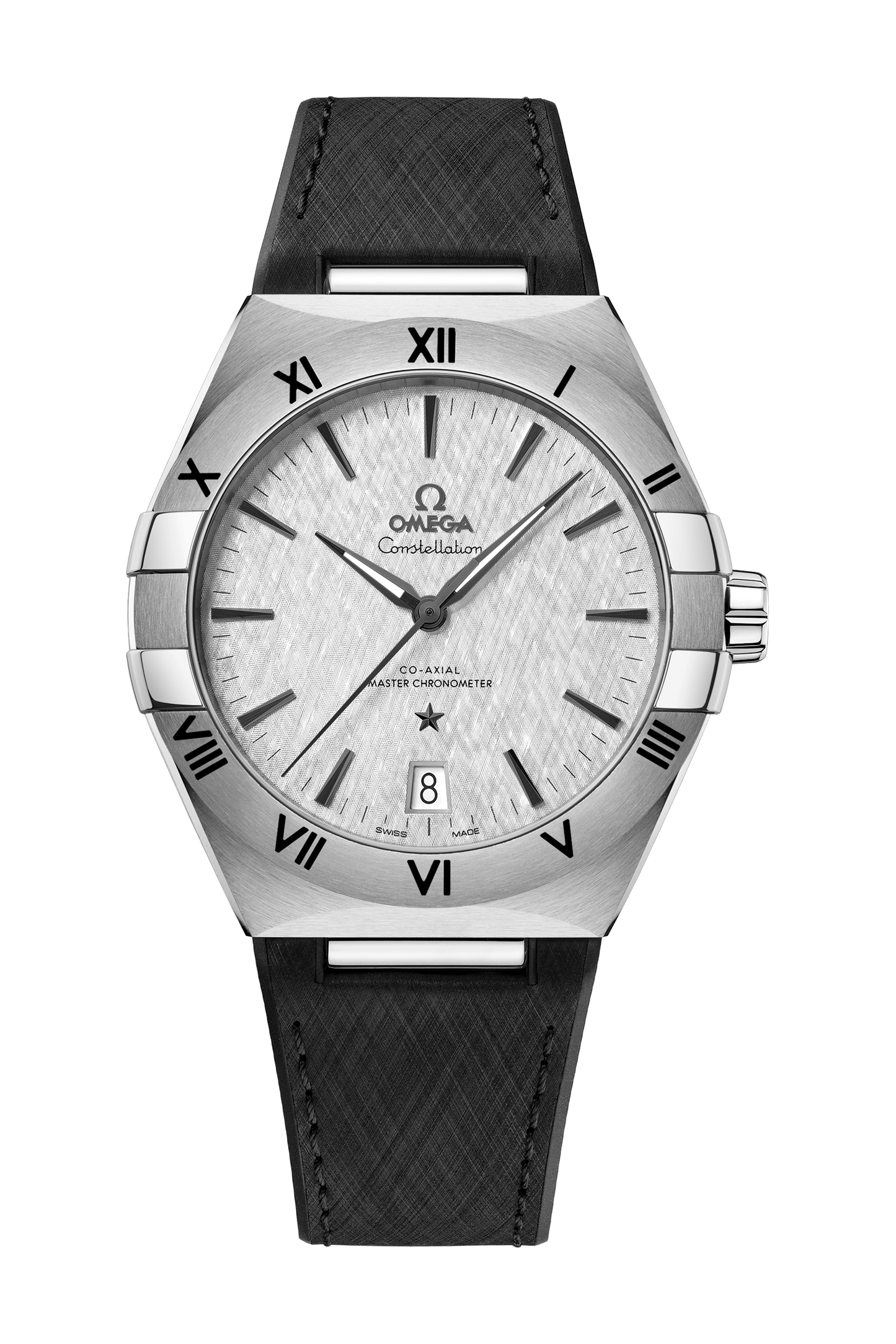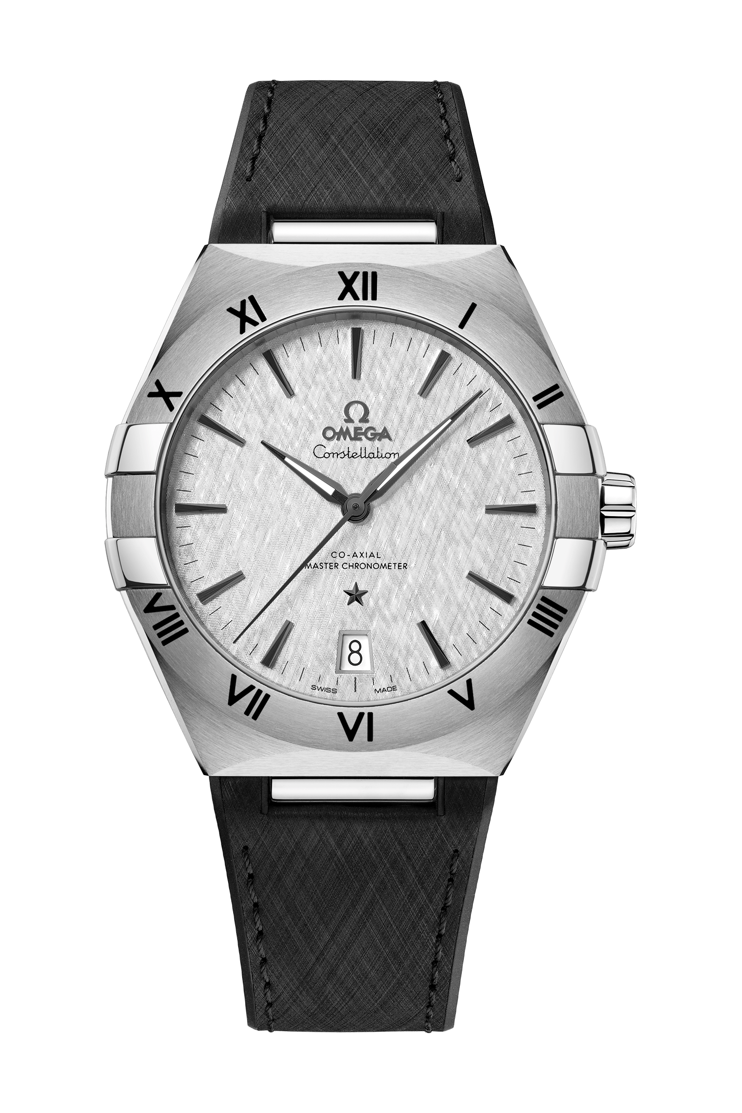 この41 mmのステンレススティール製モデルは、着色されたローマ数字を配したベゼルが印象的で、シルクエンボス加工のロジウム製グレーダイアルには、6時位置に日付窓があります。針、オメガロゴ、コンステレーションの「星」、ファセット加工のインデックスはいずれもブラックで仕上げられています。