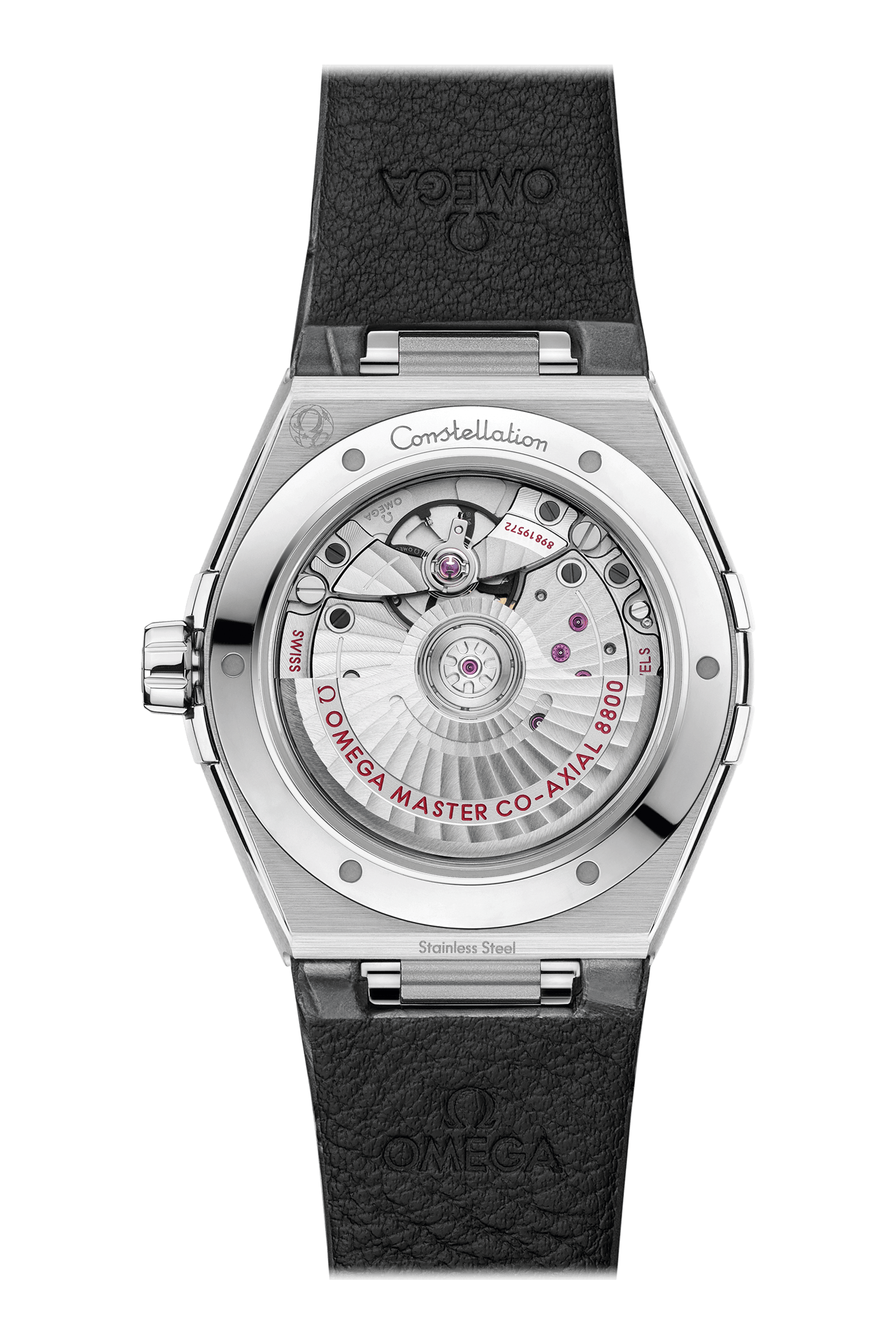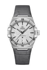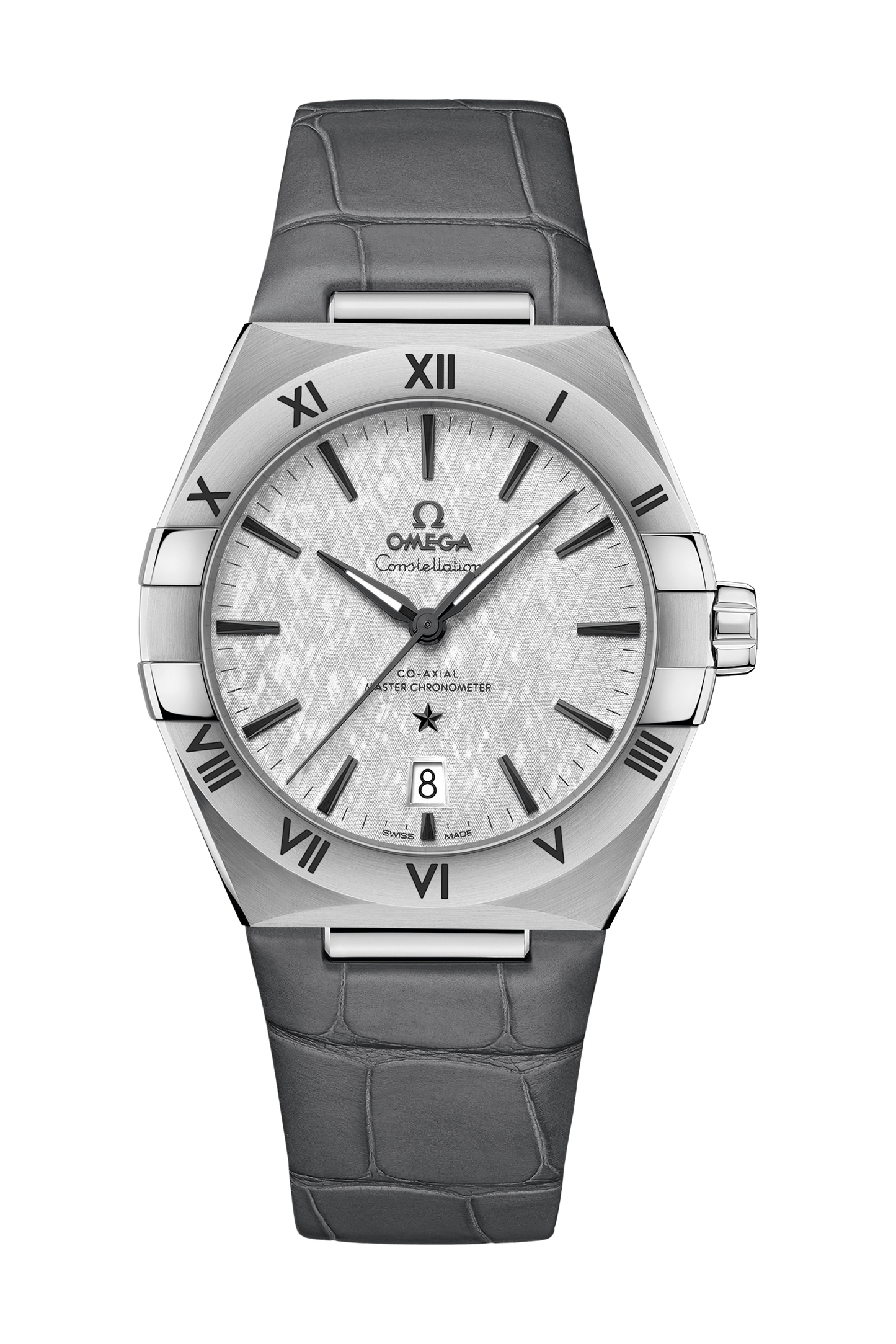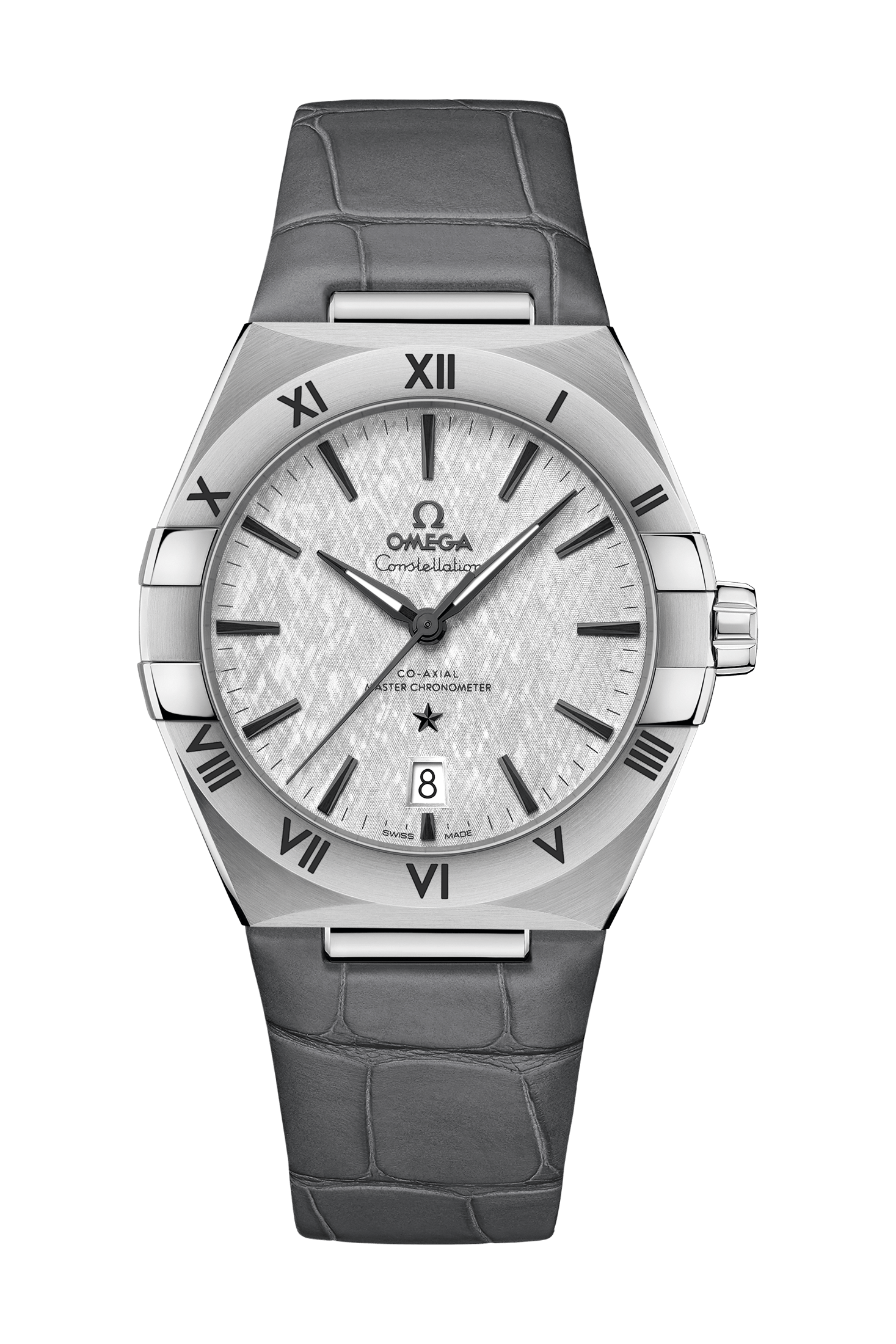 この39 mmのステンレススティール製モデルは、ローマ数字がブラックで施されたベゼルが印象的で、シルクエンボス加工のロジウム製グレーダイアルには、6時位置に日付窓があります。針、オメガロゴ、コンステレーションの「星」、インデックスはいずれもブラックで仕上げられています。