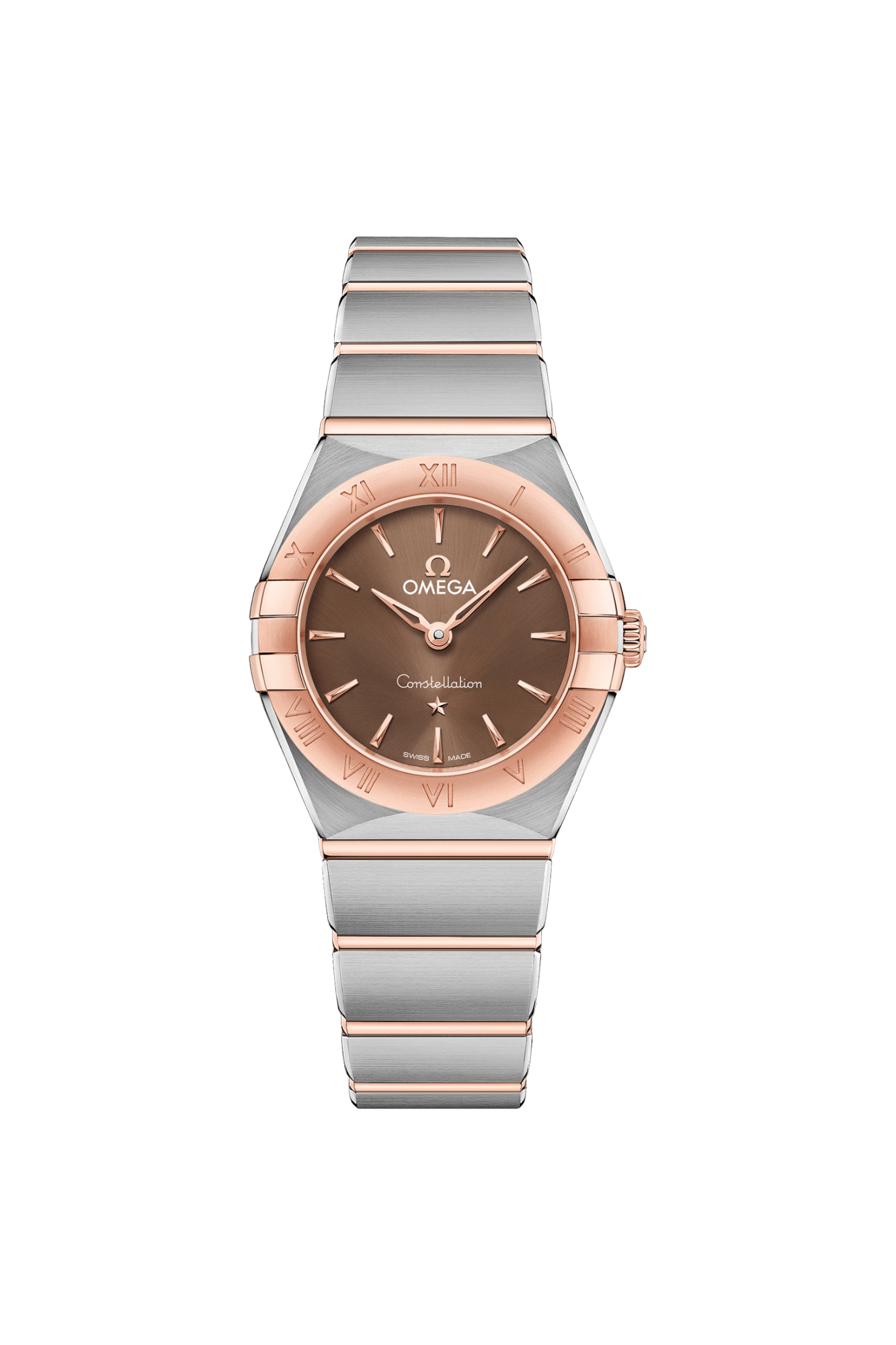 この25mmの18Kセドナ™ ゴールドとステンレススティール製のモデルは、ローマ数字が刻印されたベゼルが印象的で、サンブラッシュ仕上げのブラウンのダイアルと傷の付きにくいサファイアクリスタルガラスが採用されています。針、オメガロゴ、コンステレーションの「星」、インデックスにも18Kセドナ™ ゴールドが使用されています。