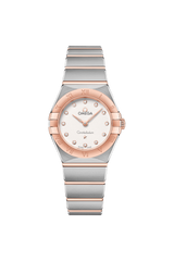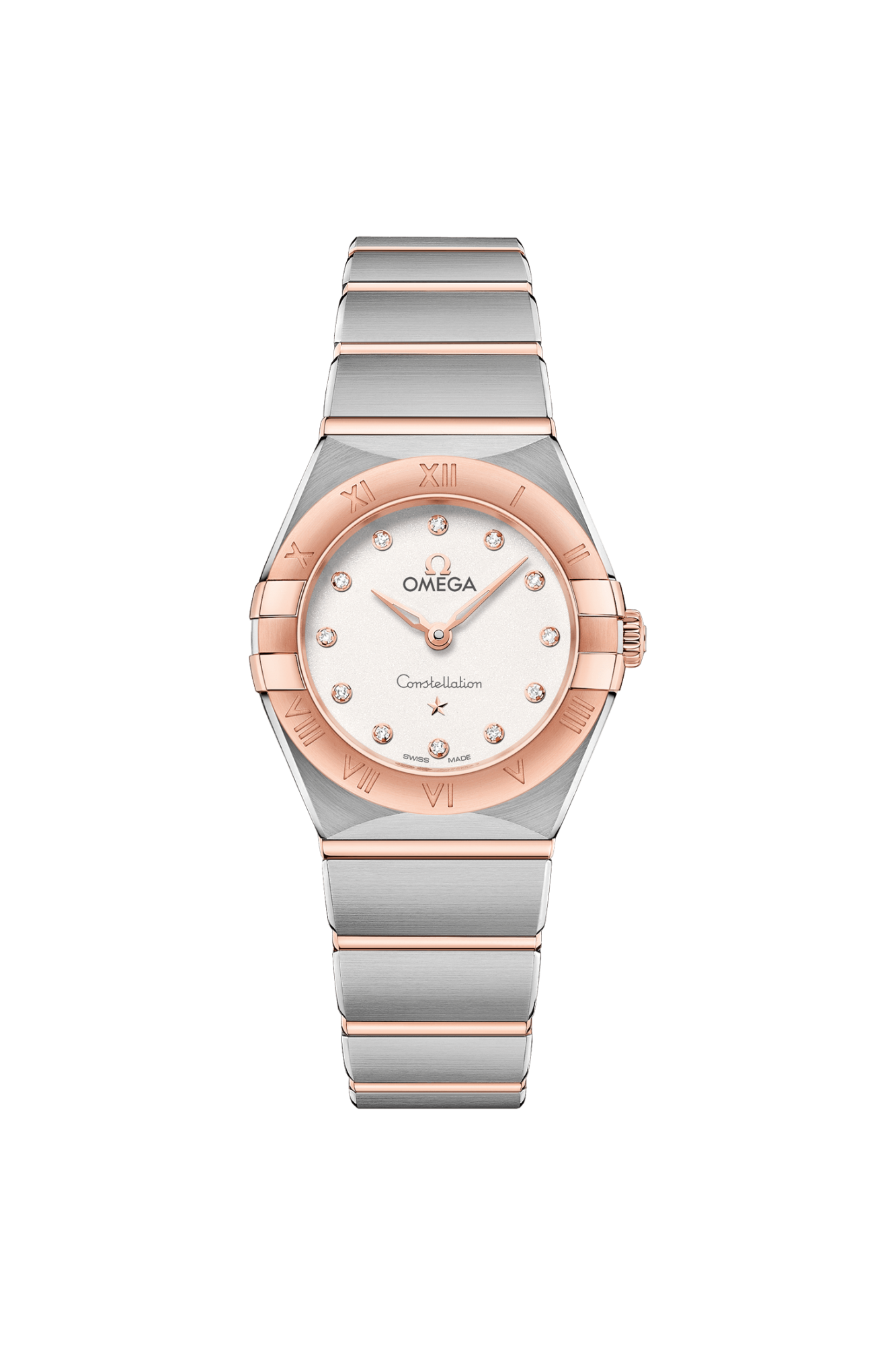 この25mmの18Kセドナ™ ゴールドとステンレススティール製のモデルは、ローマ数字が刻印されたベゼルが印象的で、クリスタルホワイトシルバーダイアルには、ダイヤモンドのインデックスが配され、傷の付きにくいサファイアクリスタルガラスが採用されています。針、オメガロゴ、コンステレーションの「星」、ダイヤモンドインデックスのベゼルにも18Kセドナ™ ゴールドが使用されています。
