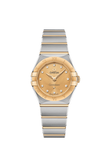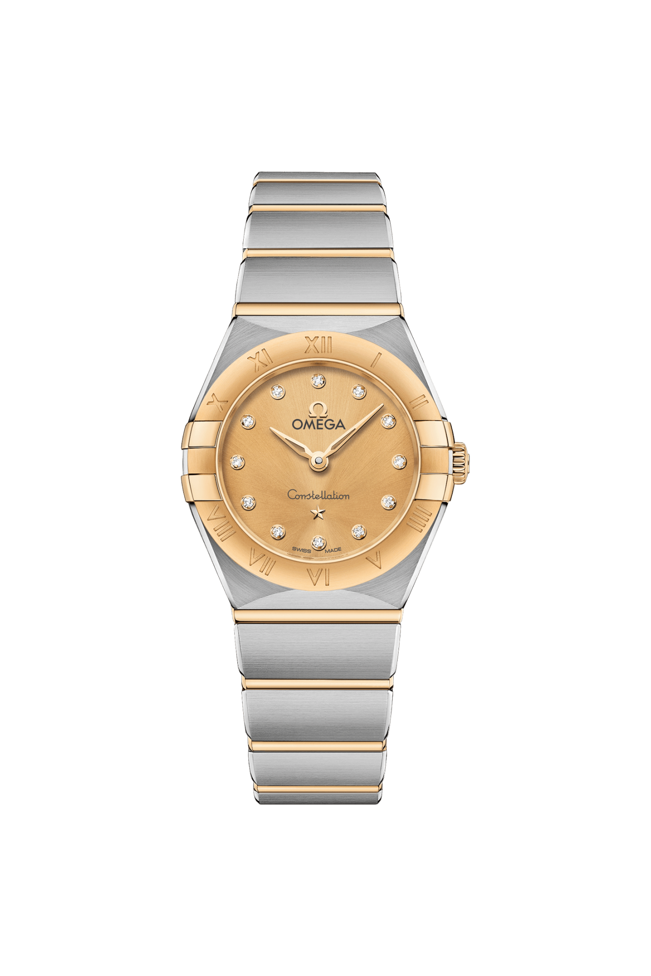 この25mmの18Kイエローゴールドとステンレススティール製のモデルは、ローマ数字が刻印されたベゼルが印象的で、サンブラッシュ仕上げのシャンパンゴールドダイアルには、ダイヤモンドのインデックスが配され、傷の付きにくいサファイアクリスタルガラスが採用されています。針、オメガロゴ、コンステレーションの「星」、ダイヤモンドインデックスのベゼルにも18Kイエローゴールドが使用されています。