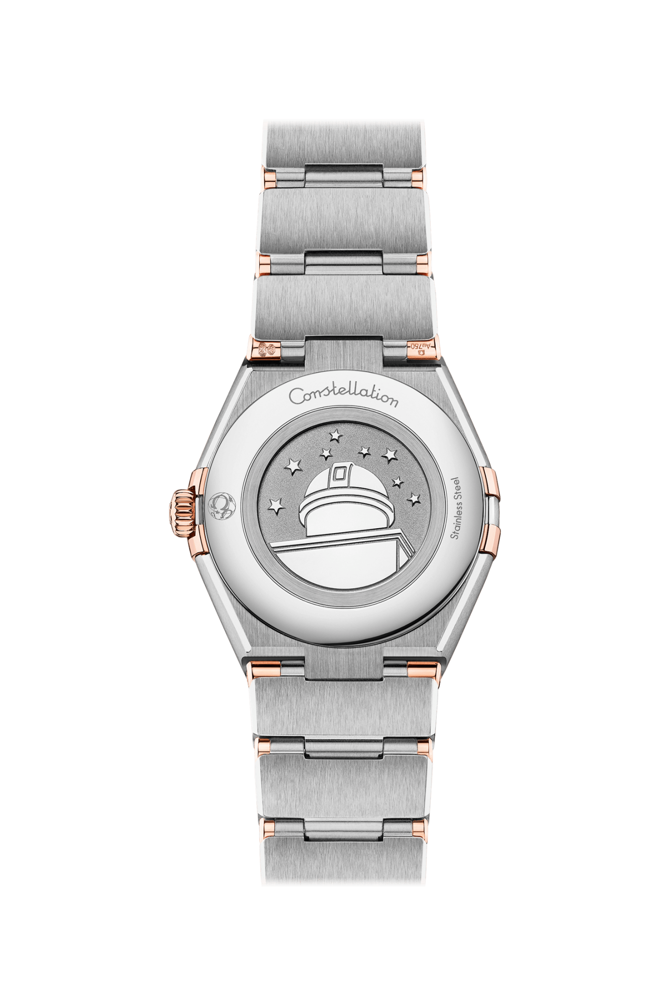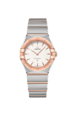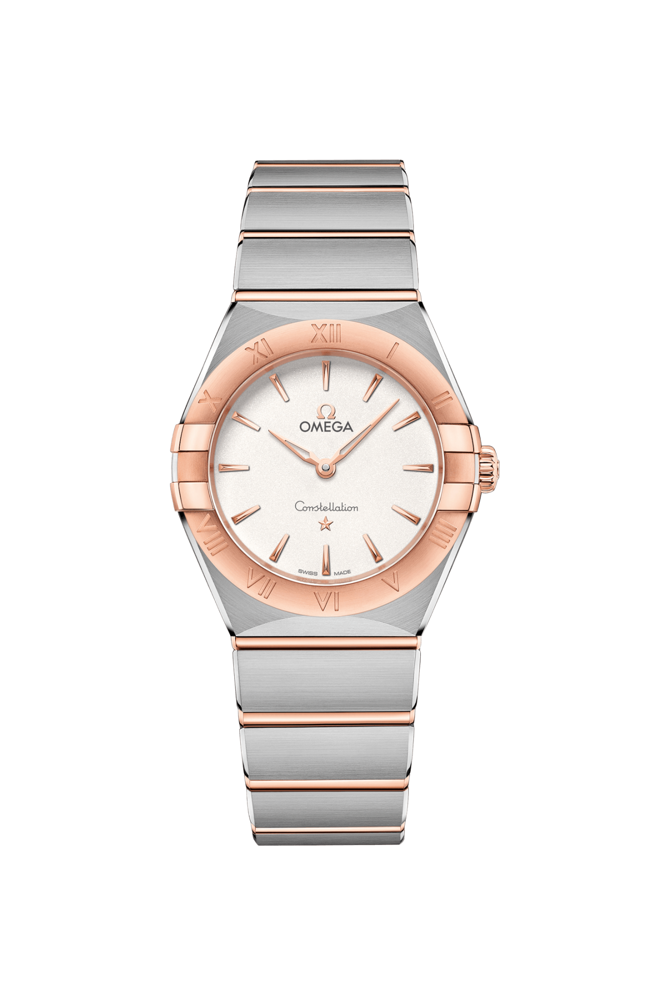 この28mmの18Kセドナ™ ゴールドとステンレススティール製のモデルは、ローマ数字が刻印されたベゼルが印象的で、クリスタルホワイトシルバーダイアルと傷の付きにくいサファイアクリスタルガラスが採用されています。針、オメガロゴ、コンステレーションの「星」、インデックスにも18Kセドナ™ ゴールドが使用されています。