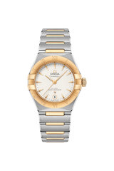 この29mmの18Kイエローゴールドとステンレススティール製のモデルは、ローマ数字が刻印されたベゼルが印象的で、クリスタルホワイトシルバーダイアルには、6時位置に日付窓があります。針、オメガロゴ、コンステレーションの「星」、インデックスにも18Kイエローゴールドが使用されています。