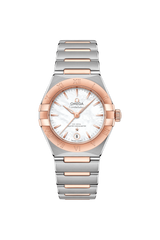 この29mmの18Kセドナ™ ゴールドとステンレススティール製のモデルは、ローマ数字が刻印されたベゼルが印象的で、マザーオブパールのダイアルには、6時位置に日付窓があります。針、オメガロゴ、コンステレーションの「星」、インデックスにも18Kセドナ™ ゴールドが使用されています。