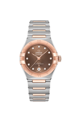 この29mmの18Kセドナ™ ゴールドとステンレススティール製のモデルは、ローマ数字が刻印されたベゼルが印象的で、サンブラッシュ仕上げのブラウンのダイアルには、ダイヤモンドのインデックスと、6時位置に日付窓があります。針、オメガロゴ、コンステレーションの「星」、ダイヤモンドインデックスのベゼルにも18Kセドナ™ ゴールドが使用されています。