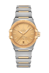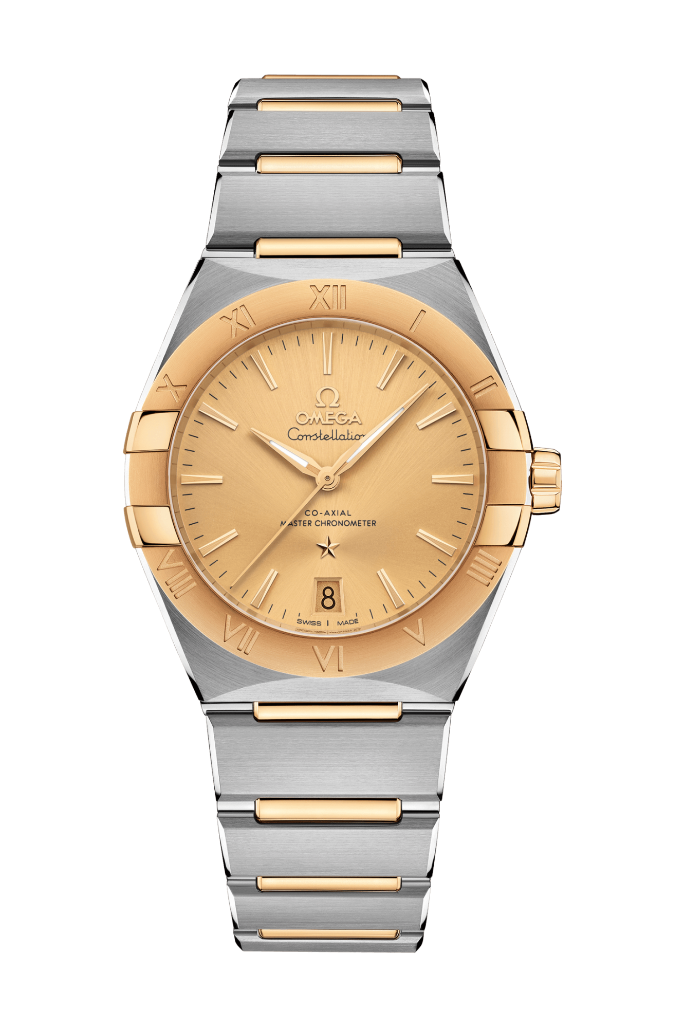 この36 mmのステンレススティール&18Kイエローゴールド製モデルは、ローマ数字が刻印されたベゼルが印象的で、サンブラッシュ仕上げのシャンパン色のダイアルには、6時位置に日付窓があります。針、オメガロゴ、コンステレーションの「星」、インデックスにはいずれも18Kイエローゴールドが使用されています。