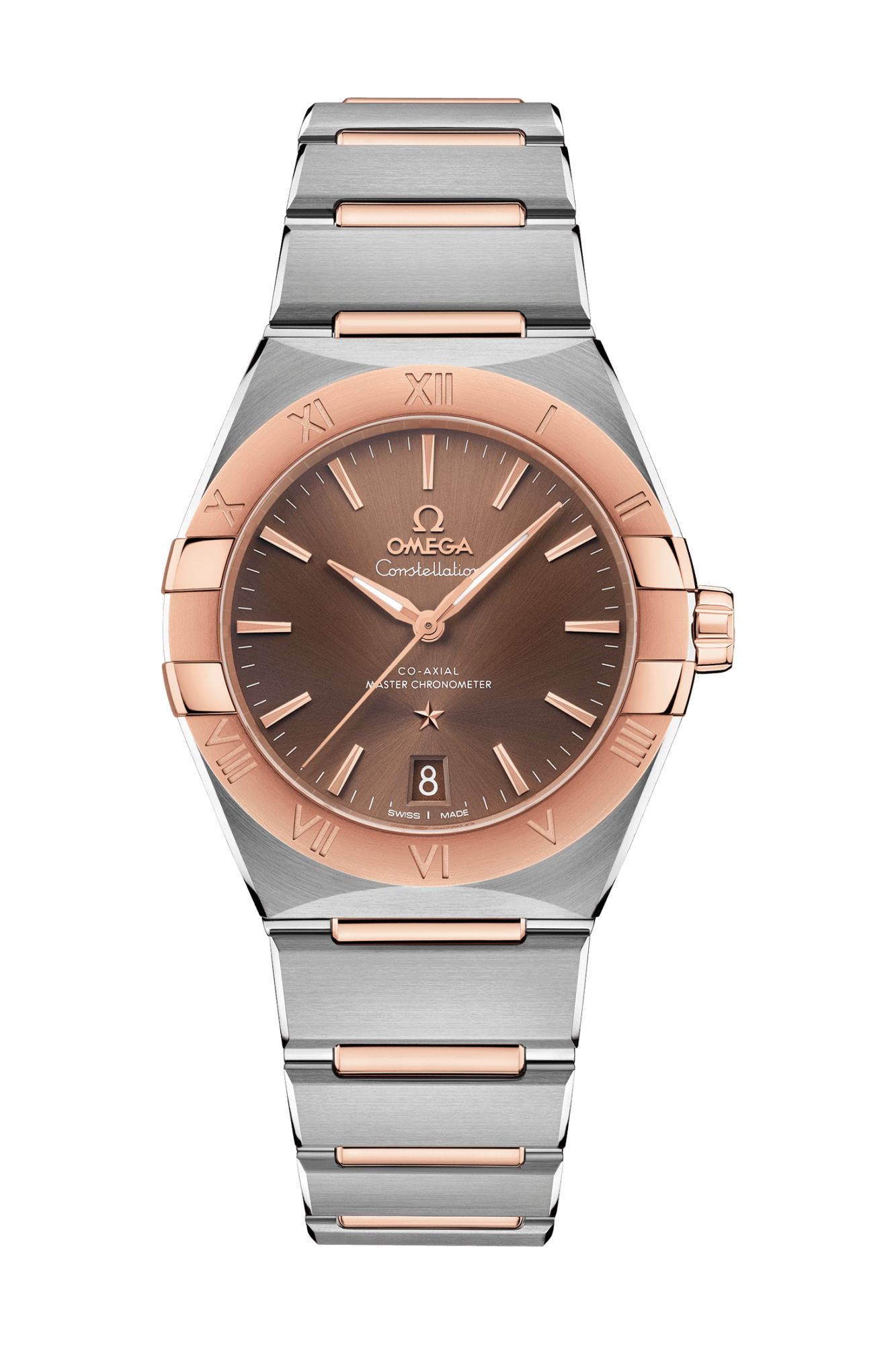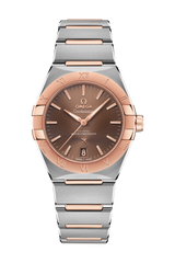 この36 mmのステンレススティール&18Kセドナ™ ゴールド製モデルは、ローマ数字が刻印されたベゼルが印象的で、サンブラッシュ仕上げのブラウンダイアルには、6時位置に日付窓があります。針、オメガロゴ、コンステレーションの「星」、インデックスにはいずれも18Kセドナ™ ゴールドが使用されています。