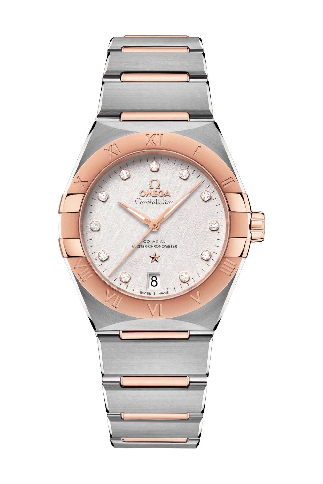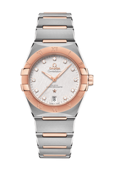 この36 mmのステンレススティール&18Kセドナ™ ゴールド製モデルは、ローマ数字が刻印されたベゼルが印象的で、ダイヤモンドインデックスがあしらわれたシルクエンボス加工のクリーミーシルバーのダイアルには、6時位置に日付窓があります。針、オメガロゴ、コンステレーションの「星」、ダイヤモンドインデックスのベゼルには、いずれも18Kセドナ™ ゴールドが使用されています。