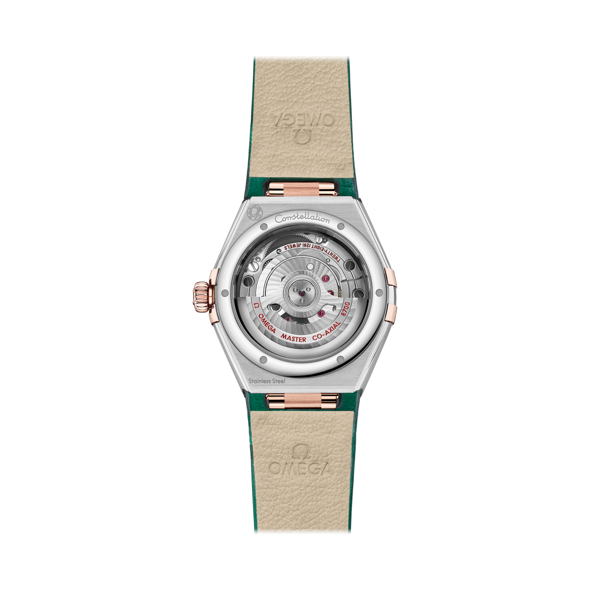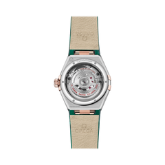 ステンレススティールおよび18Kセドナ™ゴールド製モデルは、ローマ数字が刻印されたベゼルと、6時位置の日付窓を備えます。針、インデックス、オメガロゴ、そしてコンステレーションの「星」にも18Kセドナ™ゴールドが使用されています。