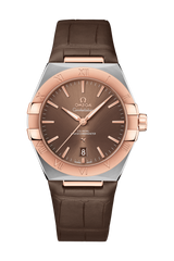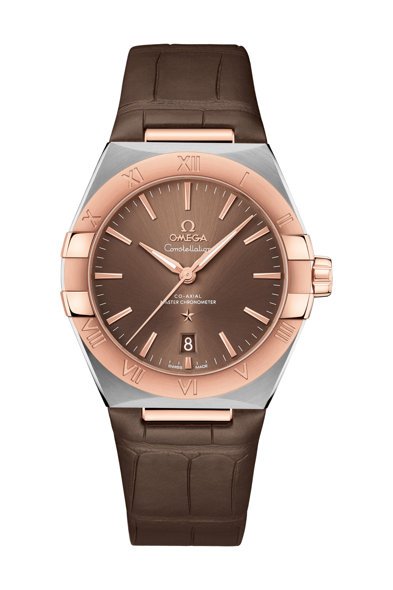 この39 mmのステンレススティール&18Kセドナ™ ゴールド製モデルは、ローマ数字が刻印されたベゼルが印象的で、サンブラッシュ仕上げのブラウンダイアルには、6時位置に日付窓があります。針、オメガロゴ、コンステレーションの「星」、インデックスにはいずれも18Kセドナ™ ゴールドが使用されています。