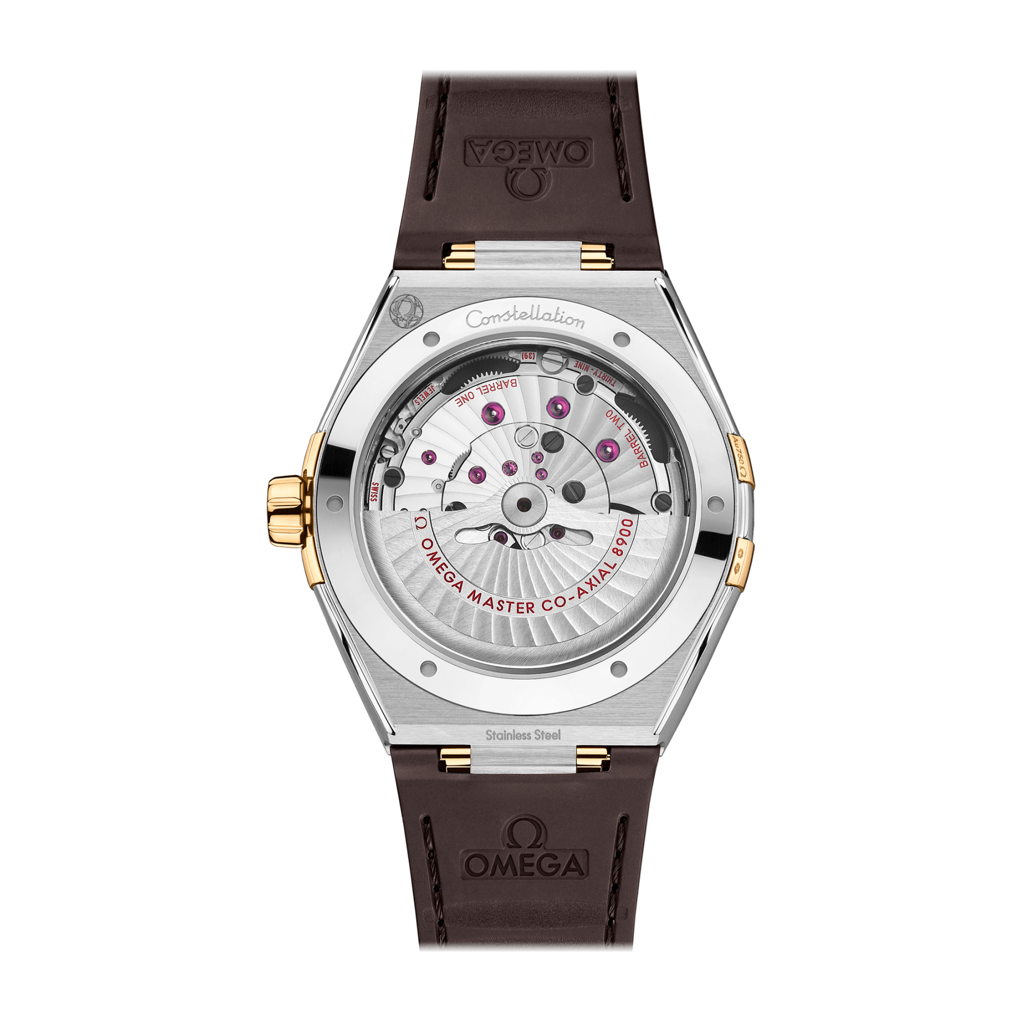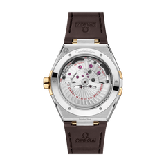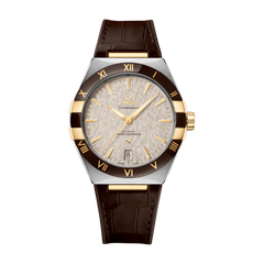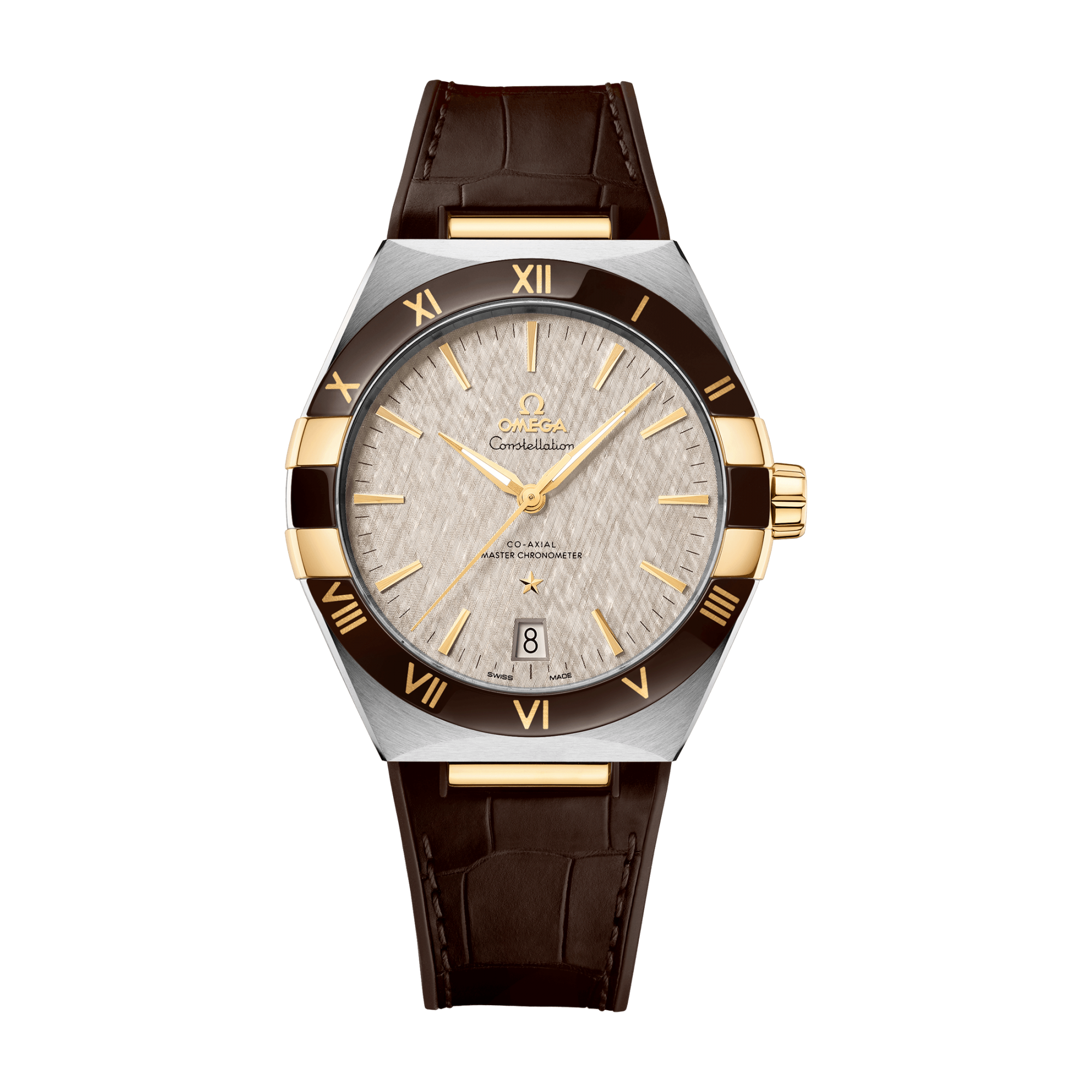 41mmサイズ、ステンレススティール&18Kイエローゴールド製のこのモデルは、オメガ独自のセラゴールド™が流し込まれたローマ数字を施した、ポリッシュ仕上げのブラウンセラミック製ベゼルリングを備えます。シルクエンボス仕上げのロジウムグレーの文字盤には、6時位置に日付表示が配されています。針、オメガロゴ、コンステレーションの「星」、インデックスにも18Kイエローゴールドが使用されています。