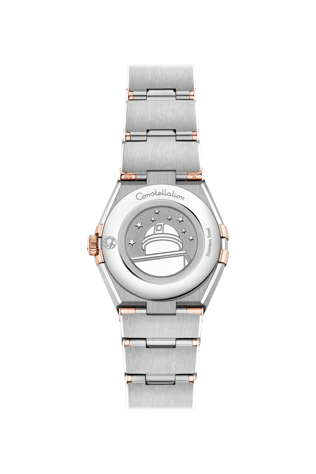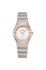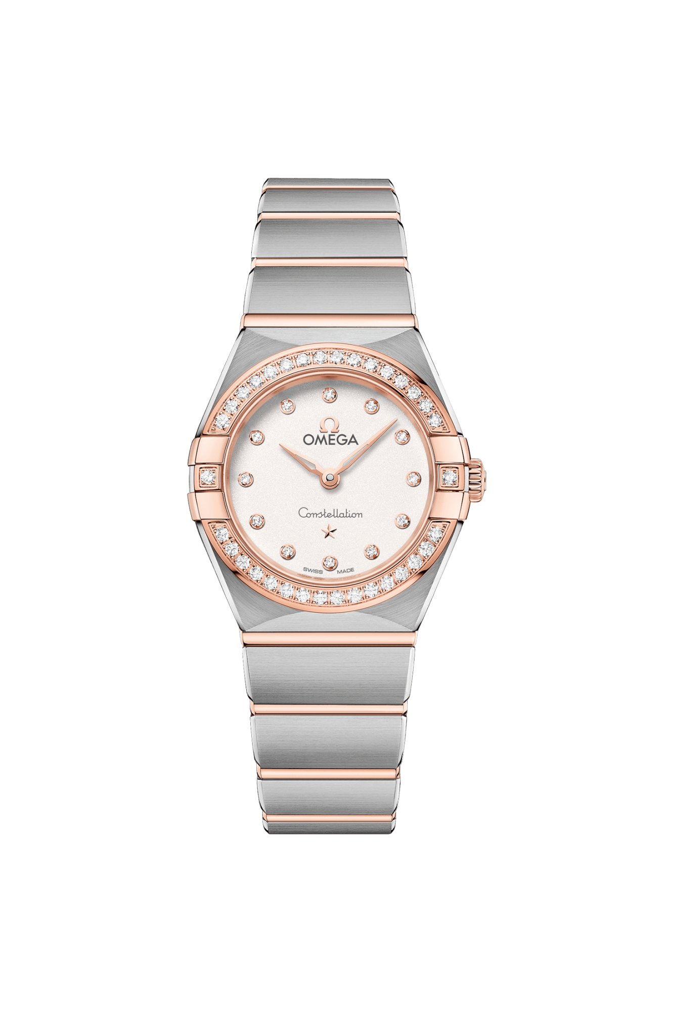 この25mmの18Kセドナ™ ゴールドとステンレススティール製のモデルは、ダイヤモンドに彩られたベゼルが印象的で、クリスタルホワイトシルバーダイアルには、ダイヤモンドのインデックスが配され、傷の付きにくいサファイアクリスタルガラスが採用されています。針、オメガロゴ、コンステレーションの「星」、ダイヤモンドインデックスのベゼルにも18Kセドナ™ ゴールドが使用されています。