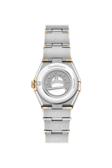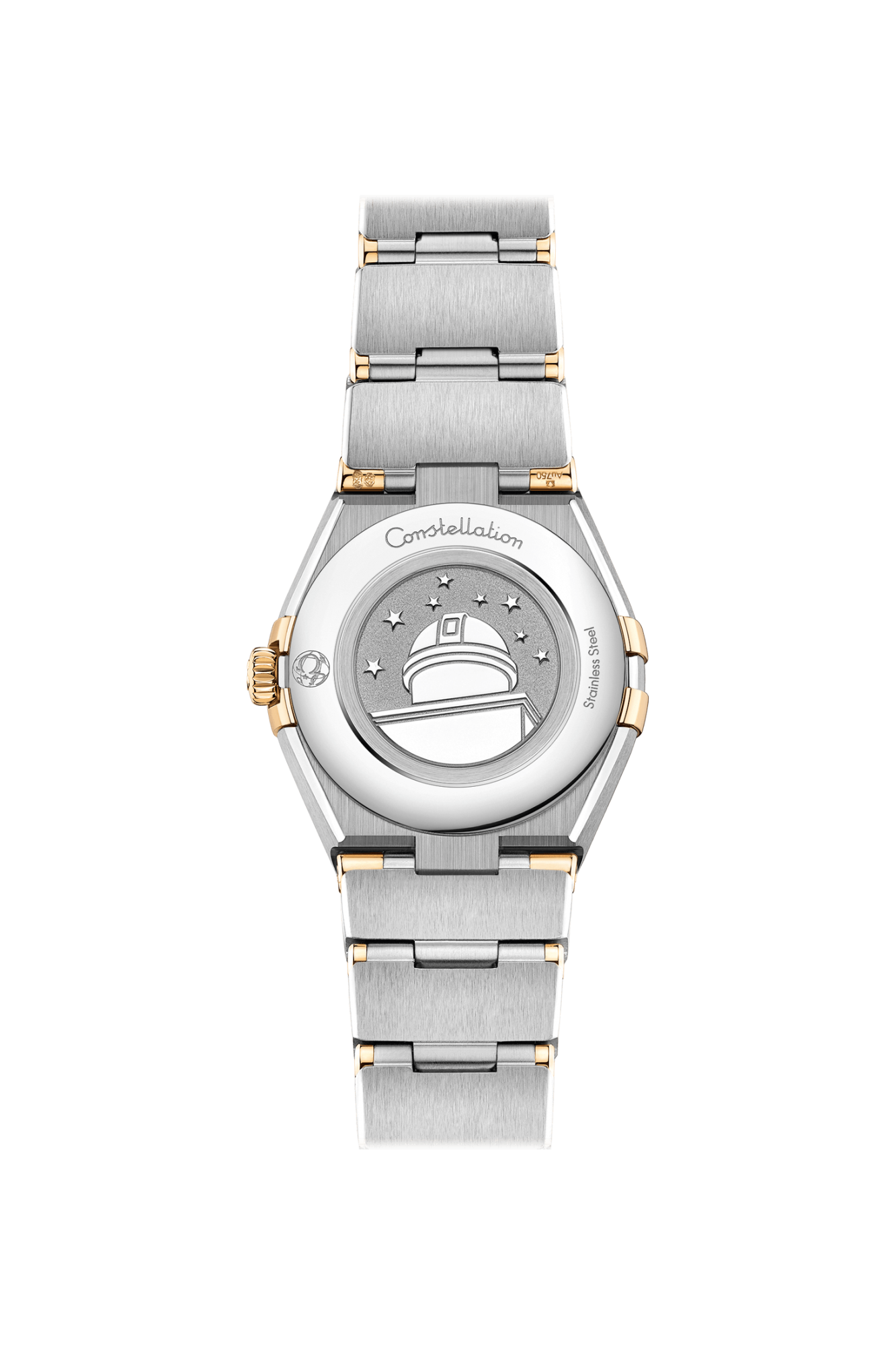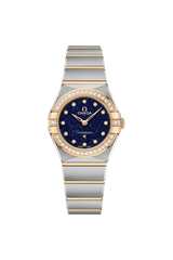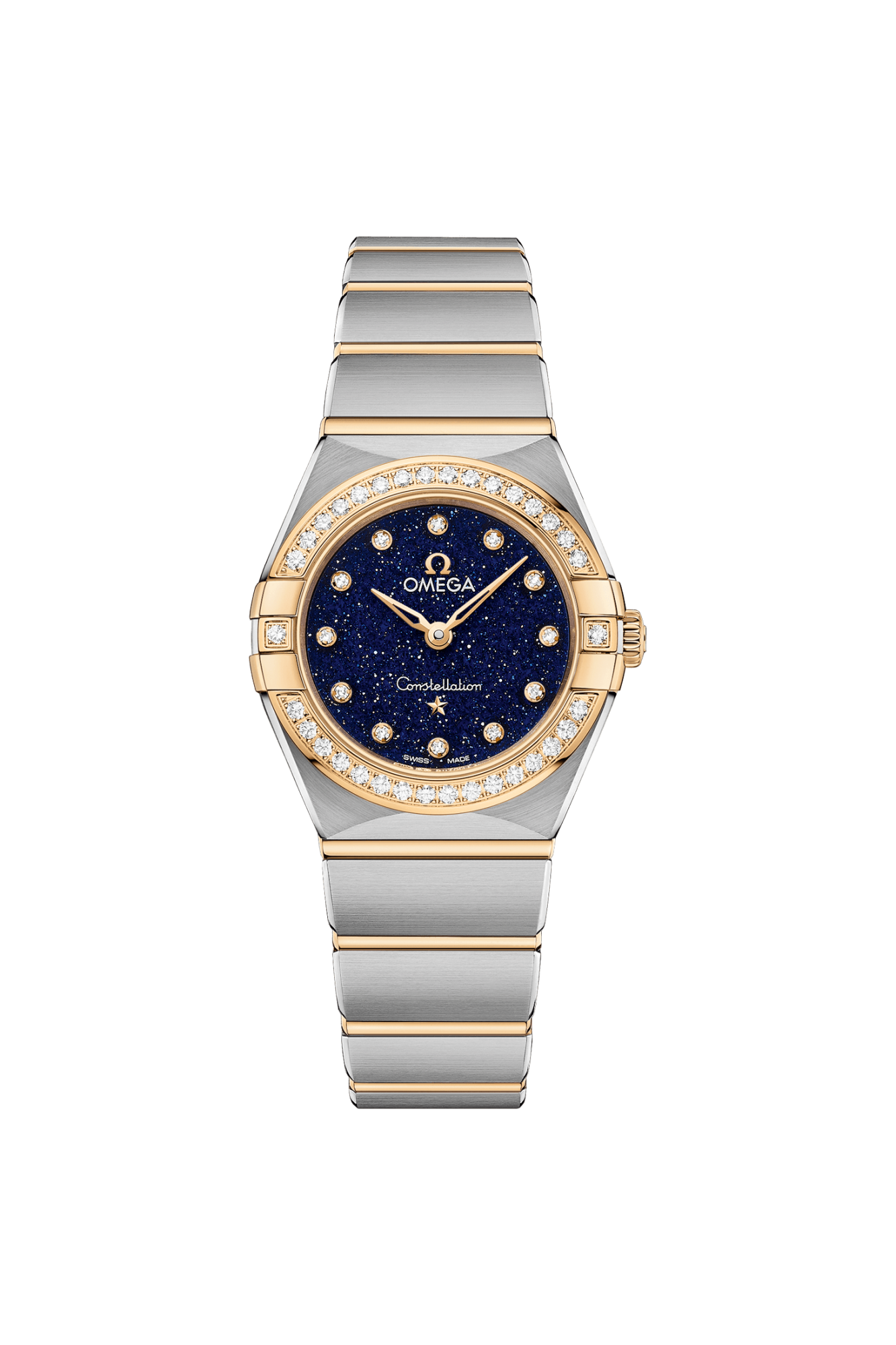 この直径25㎜の18Kイエローゴールドとステンレススティールのモデルは、ダイヤモンドに彩られたベゼルが印象的で、ブルーアベンチュリンガラス製のダイアルには、ダイヤモンドのインデックスが配されています。針、オメガロゴ、コンステレーションの「星」、ダイヤモンドインデックスのベゼルにも18Kイエローゴールドが使用されています。