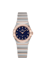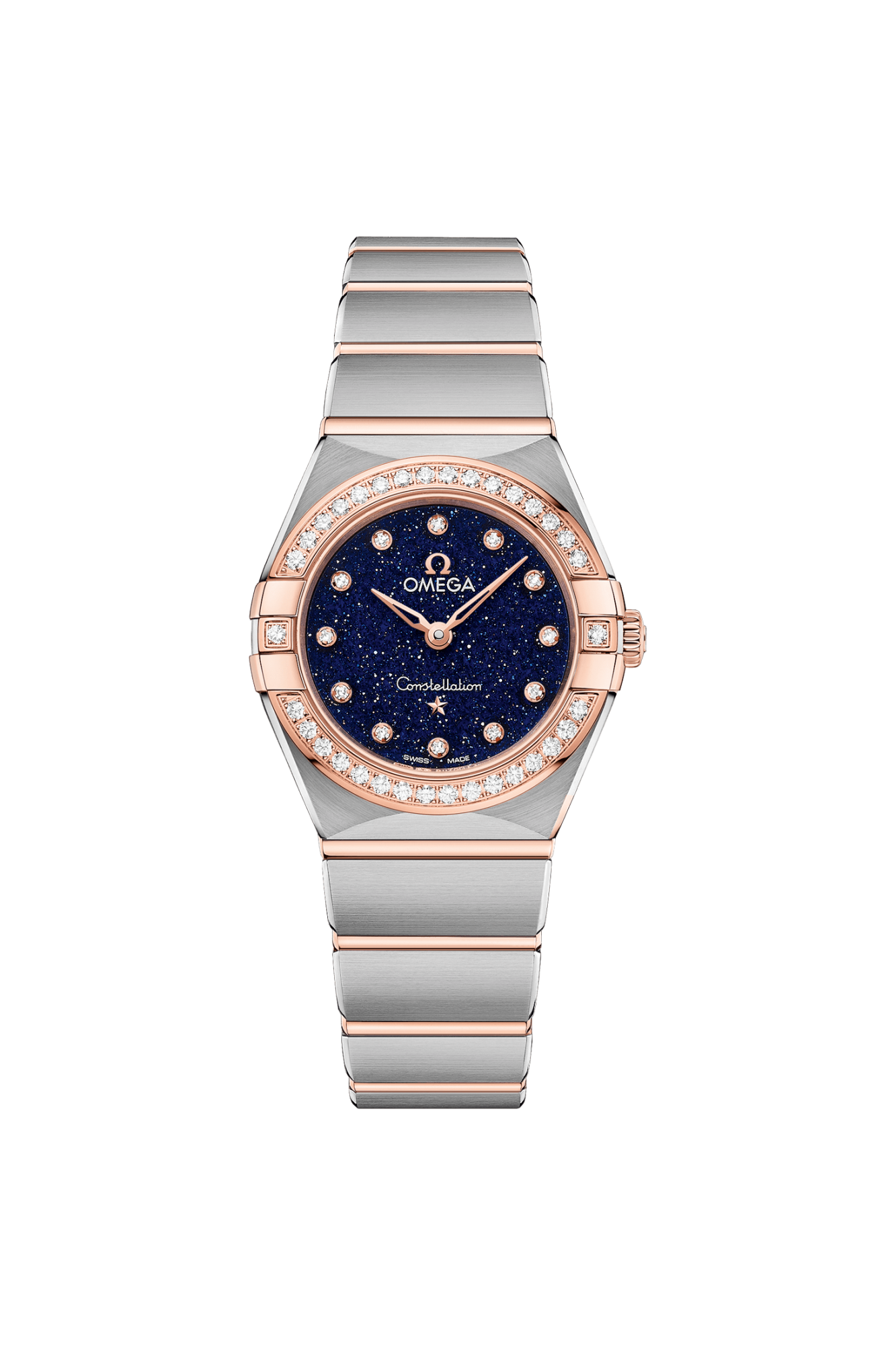この直径25㎜の18Kセドナ™ ゴールドとステンレススティール製のモデルは、ダイヤモンドに彩られたベゼルが印象的で、ブルーアベンチュリンガラス製のダイアルには、ダイヤモンドのインデックスが配されています。針、オメガロゴ、コンステレーションの「星」、ダイヤモンドインデックスのベゼルにも18Kセドナ™ ゴールドが使用されています。