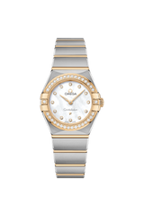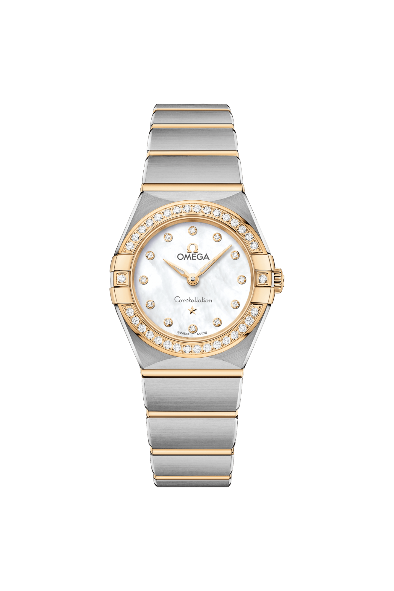 この25mmの18Kイエローゴールドとステンレススティール製のモデルは、ダイヤモンドに彩られたベゼルが印象的で、ホワイトマザーオブパールのダイアルには、ダイヤモンドのインデックスが配され、傷の付きにくいサファイアクリスタルガラスが採用されています。針、オメガロゴ、コンステレーションの「星」、ダイヤモンドインデックスのベゼルにも18Kイエローゴールドが使用されています。