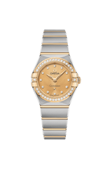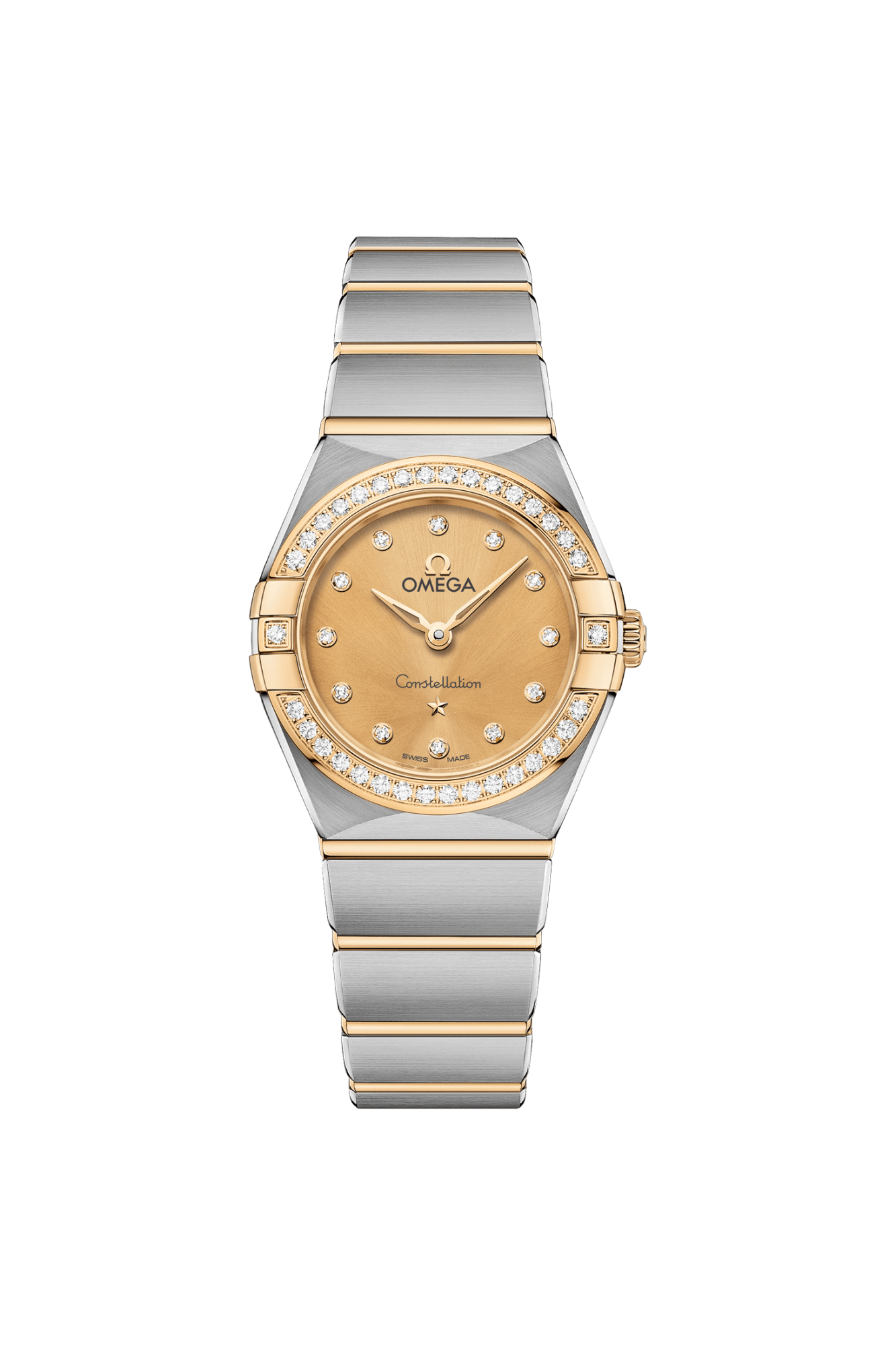 この25mmの18Kイエローゴールドとステンレススティール製のモデルは、ダイヤモンドに彩られたベゼルが印象的で、サンブラッシュ仕上げのシャンパンゴールドダイアルには、ダイヤモンドのインデックスが配され、傷の付きにくいサファイアクリスタルガラスが採用されています。針、オメガロゴ、コンステレーションの「星」、ダイヤモンドインデックスのベゼルにも18Kイエローゴールドが使用されています