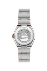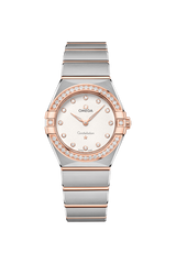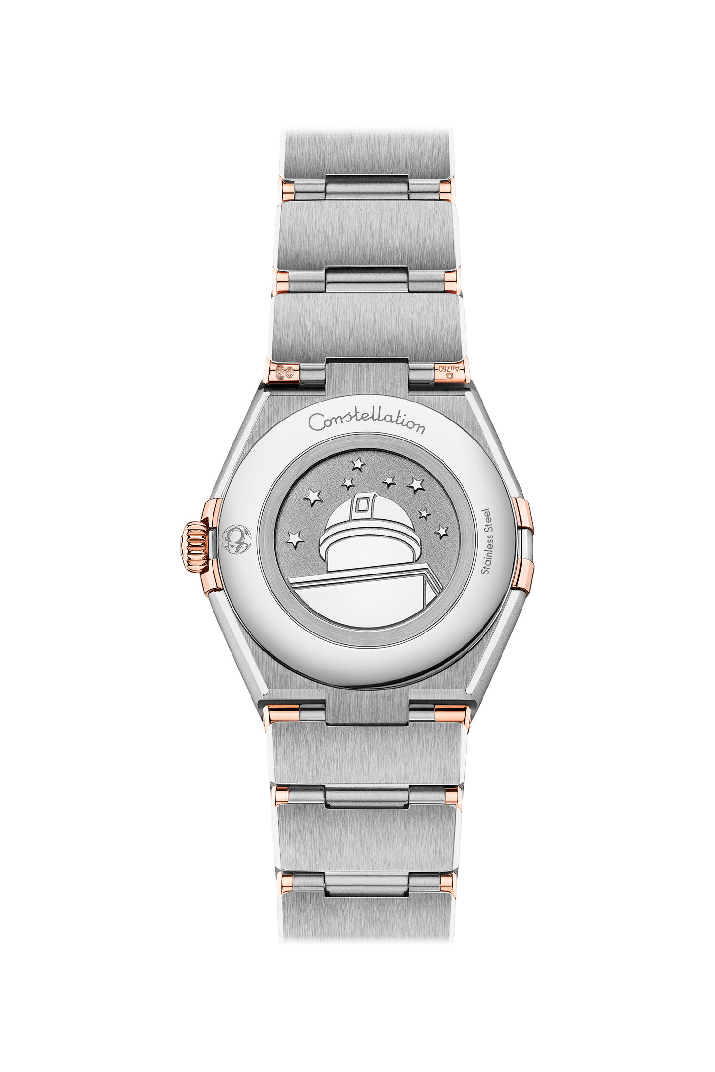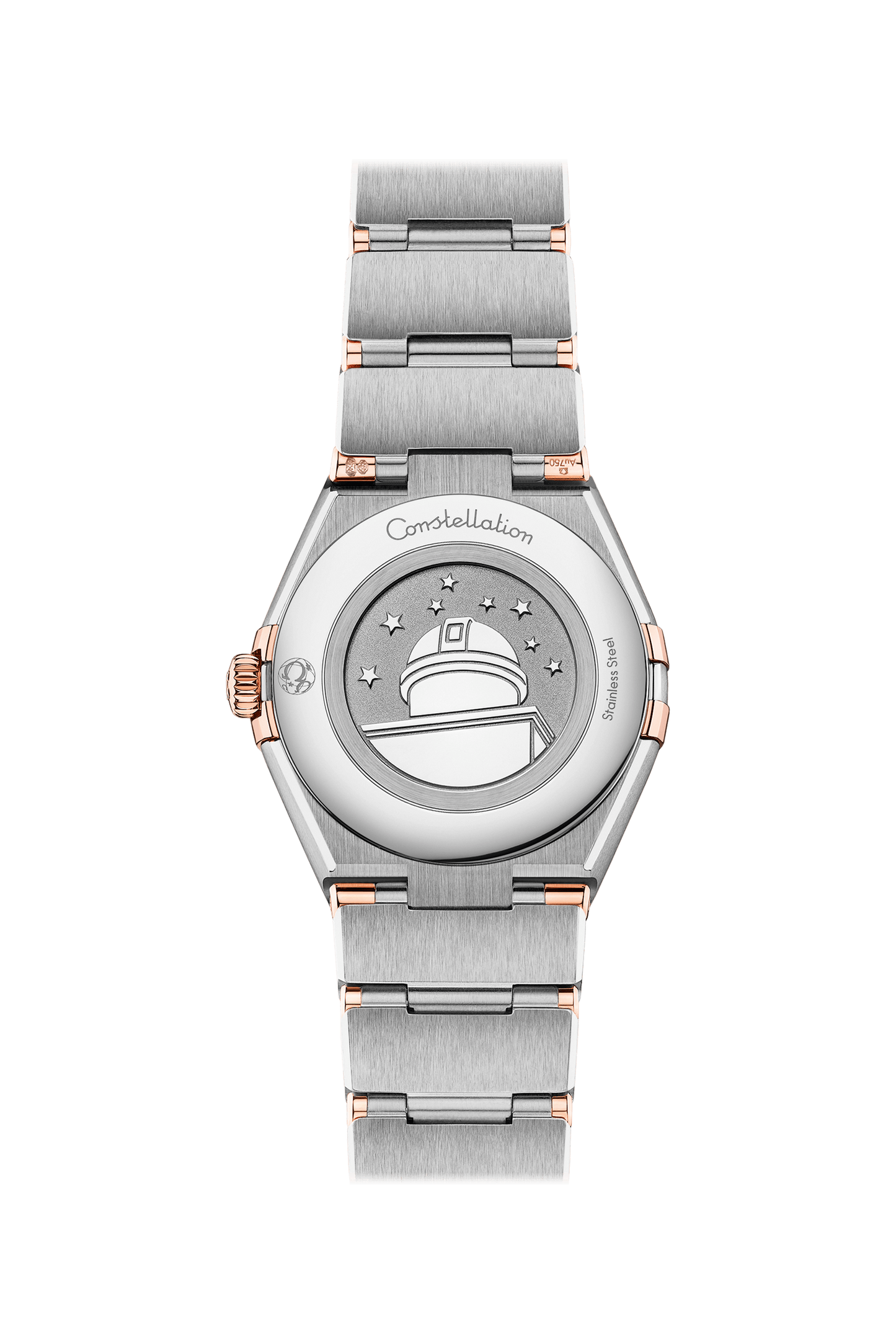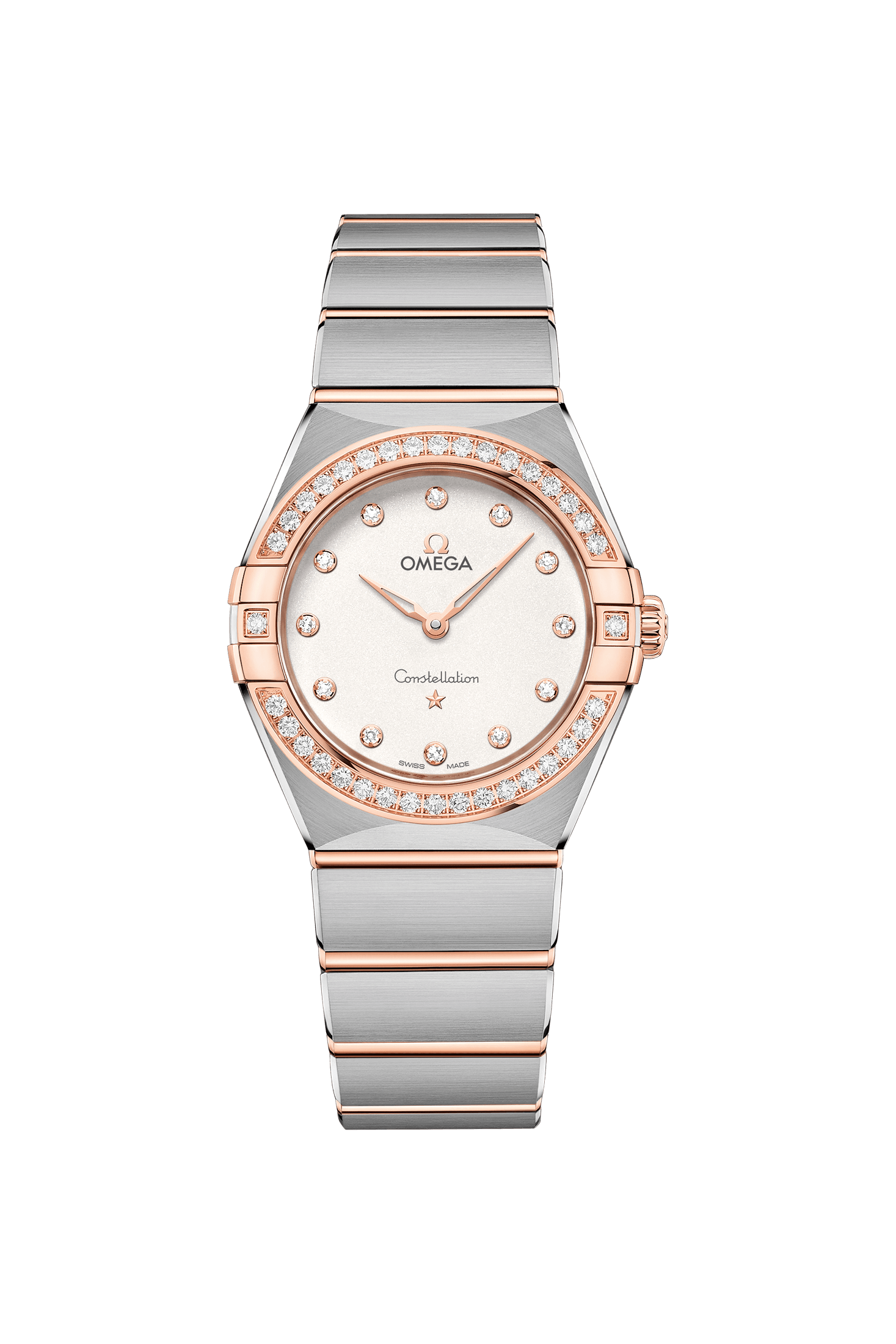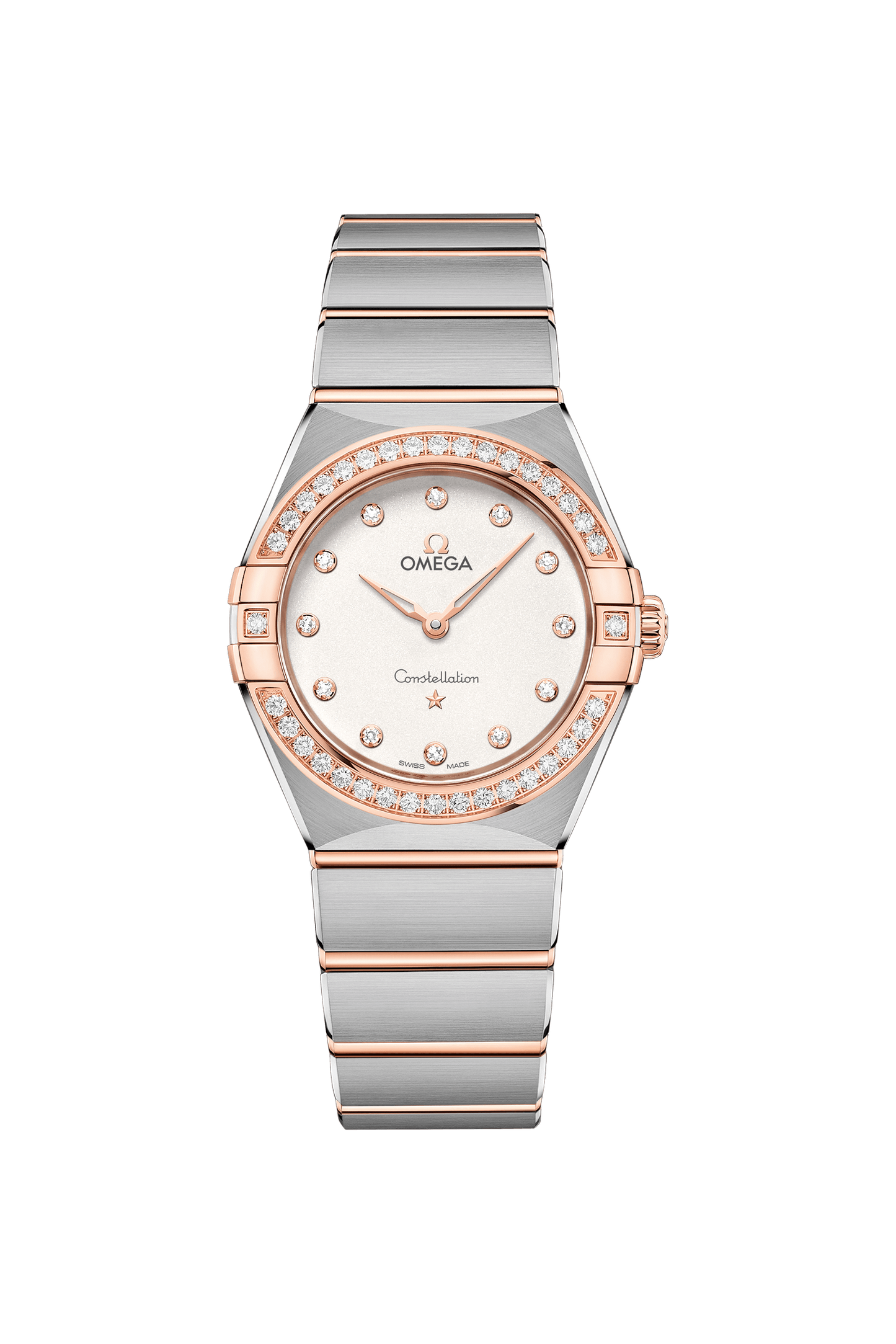 この28mmの18Kセドナ™ ゴールドとステンレススティール製のモデルは、ダイヤモンドに彩られたベゼルが印象的で、クリスタルホワイトシルバーダイアルには、ダイヤモンドのインデックスが配され、傷の付きにくいサファイアクリスタルガラスが採用されています。針、オメガロゴ、コンステレーションの「星」、ダイヤモンドインデックスのベゼルにも18Kセドナ™ ゴールドが使用されています。