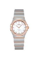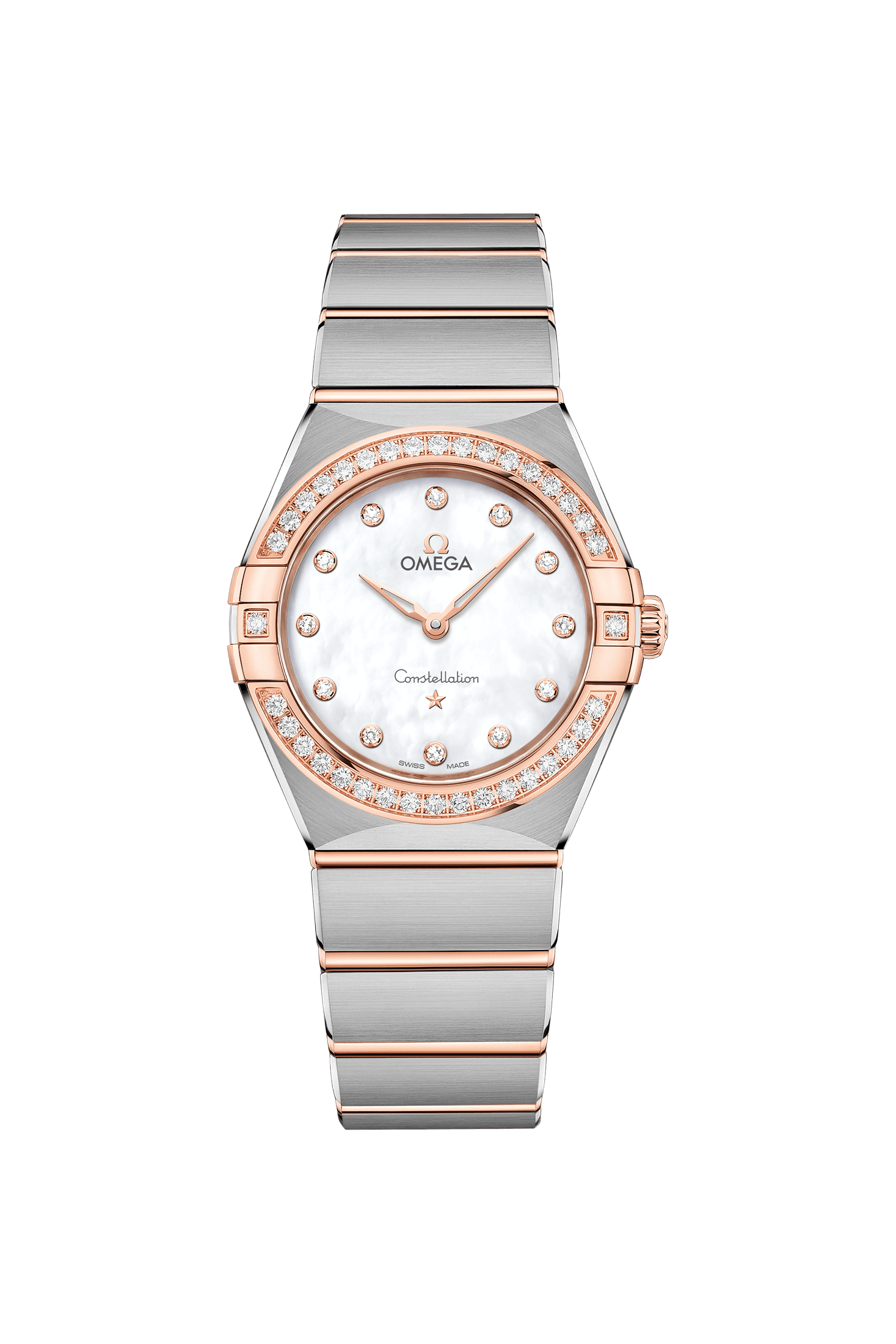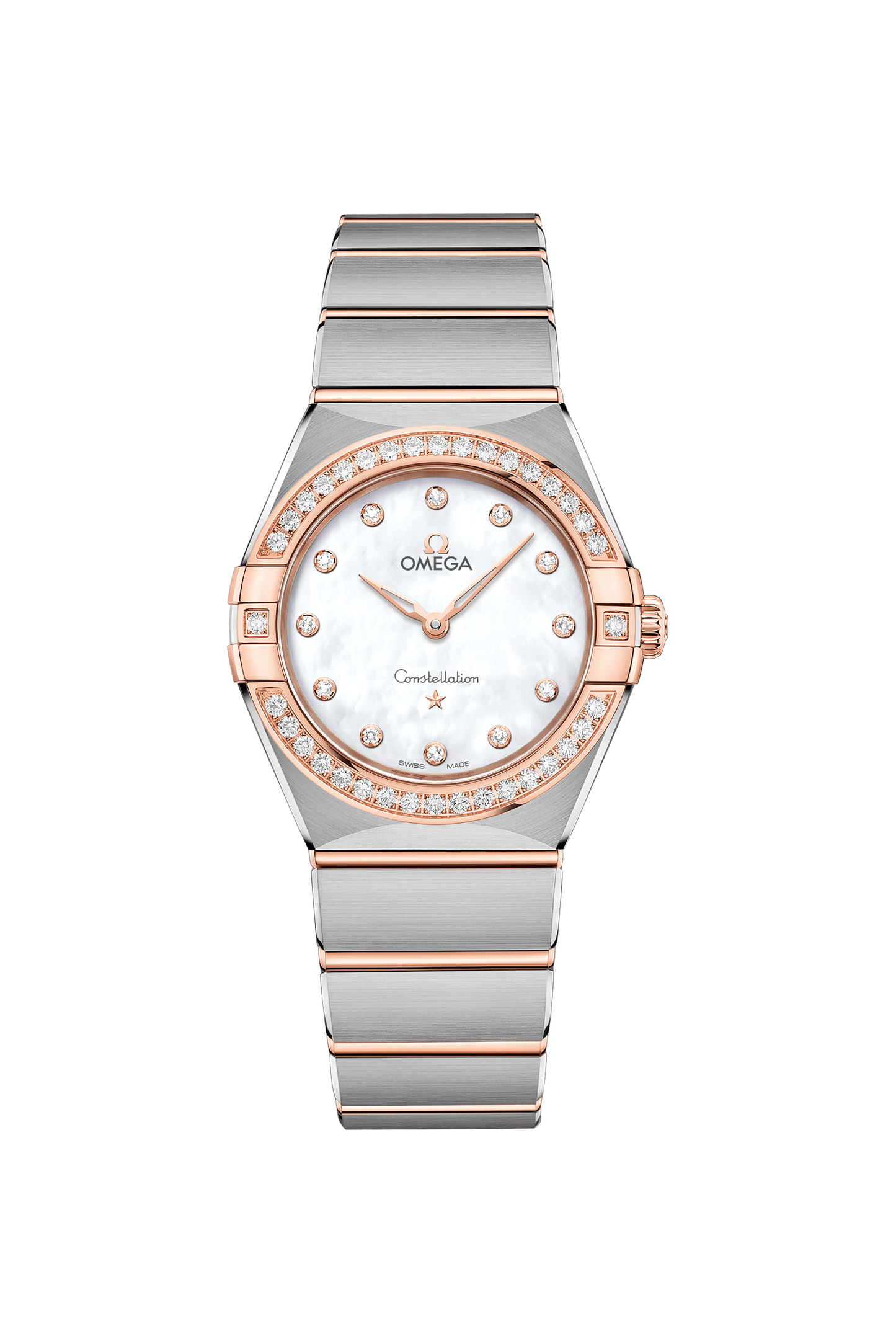 この28mmの18Kセドナ™ ゴールドとステンレススティール製のモデルは、ダイヤモンドに彩られたベゼルが印象的で、ホワイトマザーオブパールのダイアルには、ダイヤモンドのインデックスが配され、傷の付きにくいサファイアクリスタルガラスが採用されています。針、オメガロゴ、コンステレーションの「星」、ダイヤモンドインデックスのベゼルにも18Kセドナ™ ゴールドが使用されています。