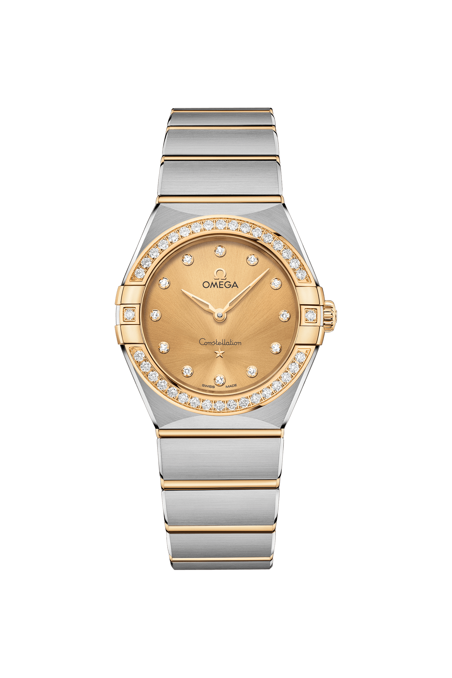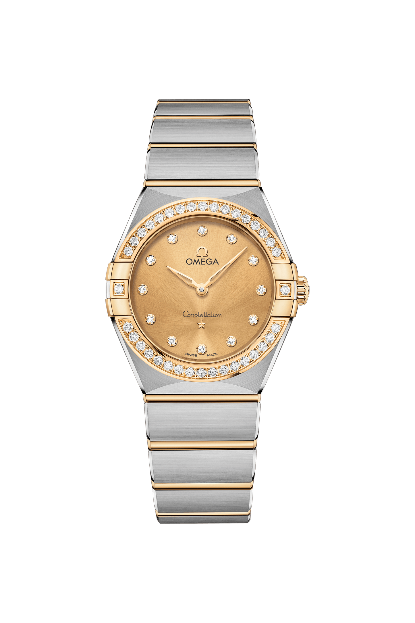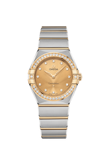 この28mmの18Kイエローゴールドとステンレススティール製のモデルは、ダイヤモンドに彩られたベゼルが印象的で、サンブラッシュ仕上げのシャンパンゴールドダイアルには、ダイヤモンドのインデックスが配され、傷の付きにくいサファイアクリスタルガラスが採用されています。針、オメガロゴ、コンステレーションの「星」、ダイヤモンドインデックスのベゼルにも18Kイエローゴールドが使用されています。
