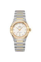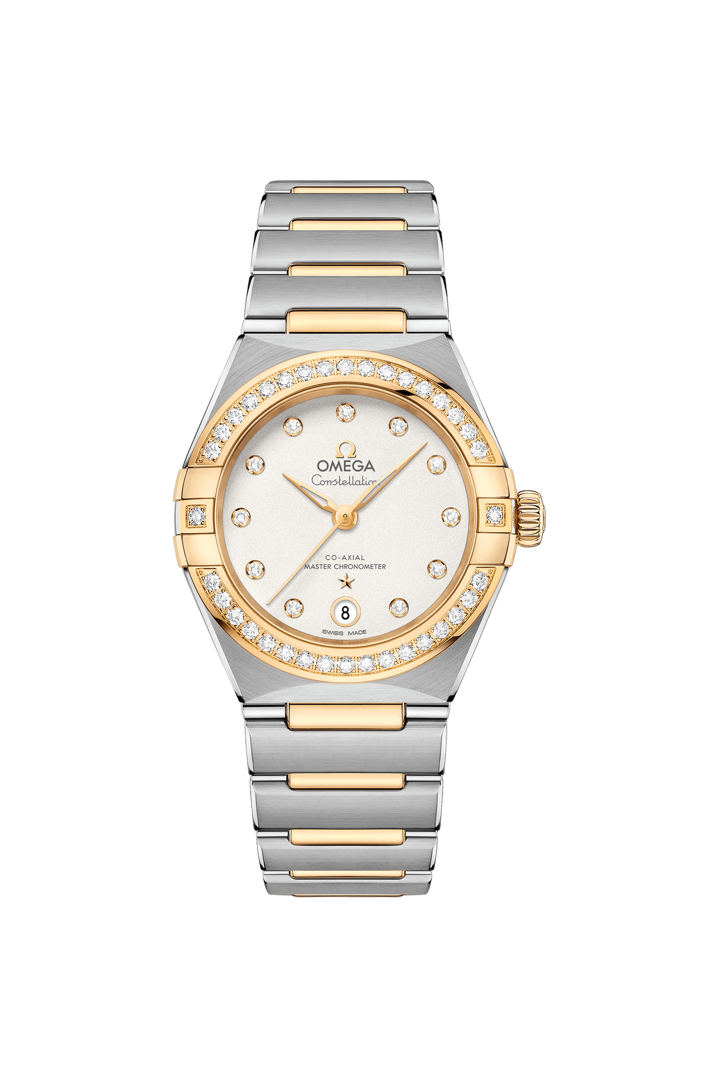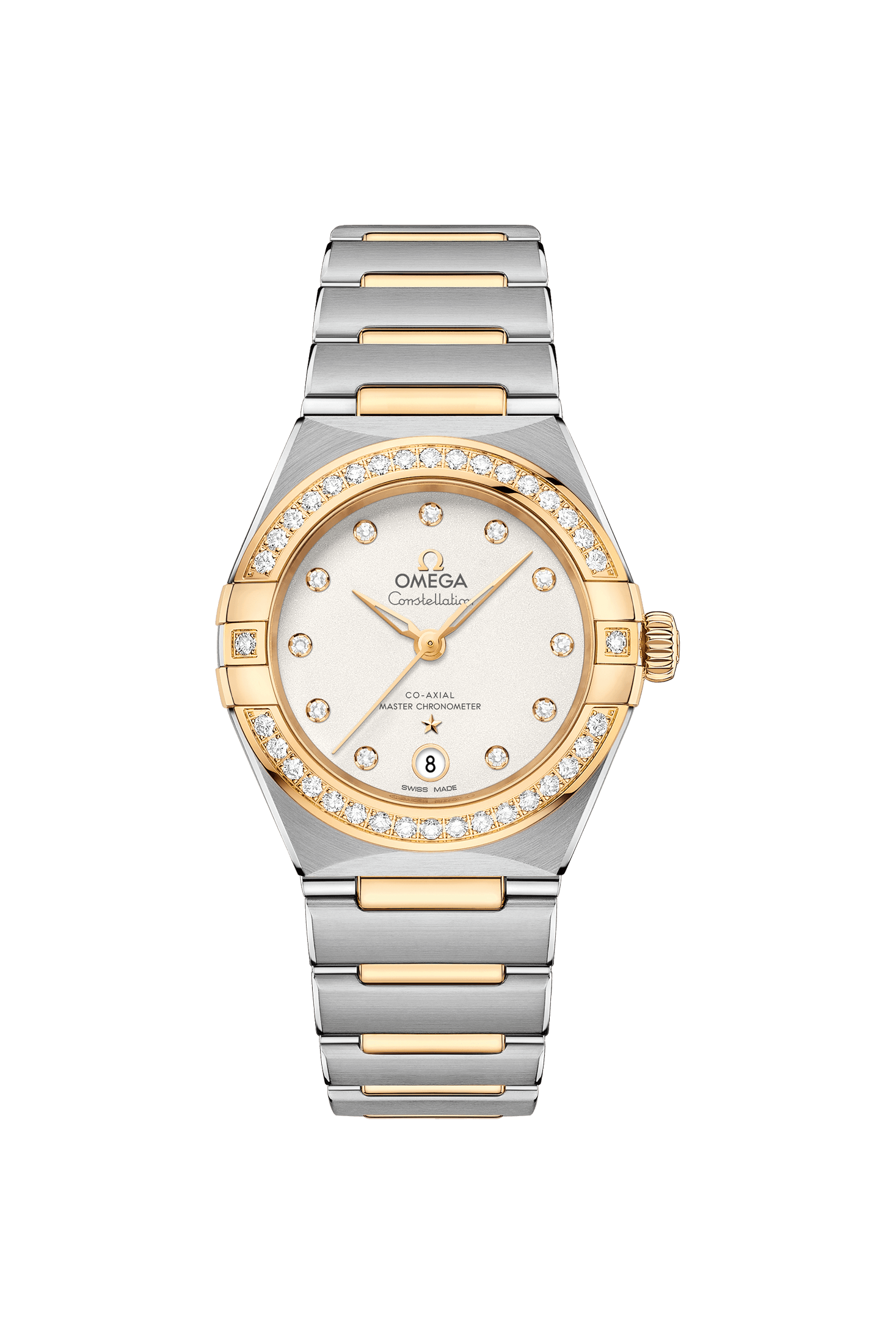 この29mmの18Kイエローゴールドとステンレススティール製のモデルは、ダイヤモンドに彩られたベゼルが印象的で、クリスタルホワイトシルバーダイアルには、ダイヤモンドのインデックスと、6時位置に日付窓があります。針、オメガロゴ、コンステレーションの「星」、ダイヤモンドインデックスのベゼルにも18Kイエローゴールドが使用されています。