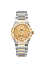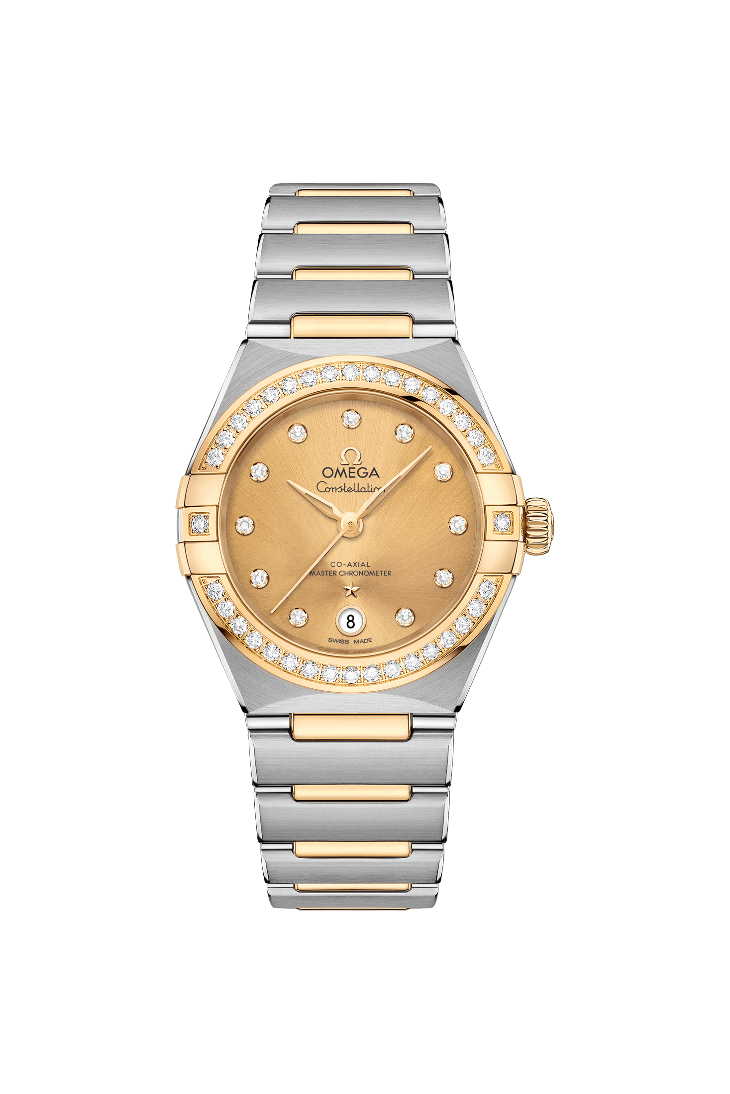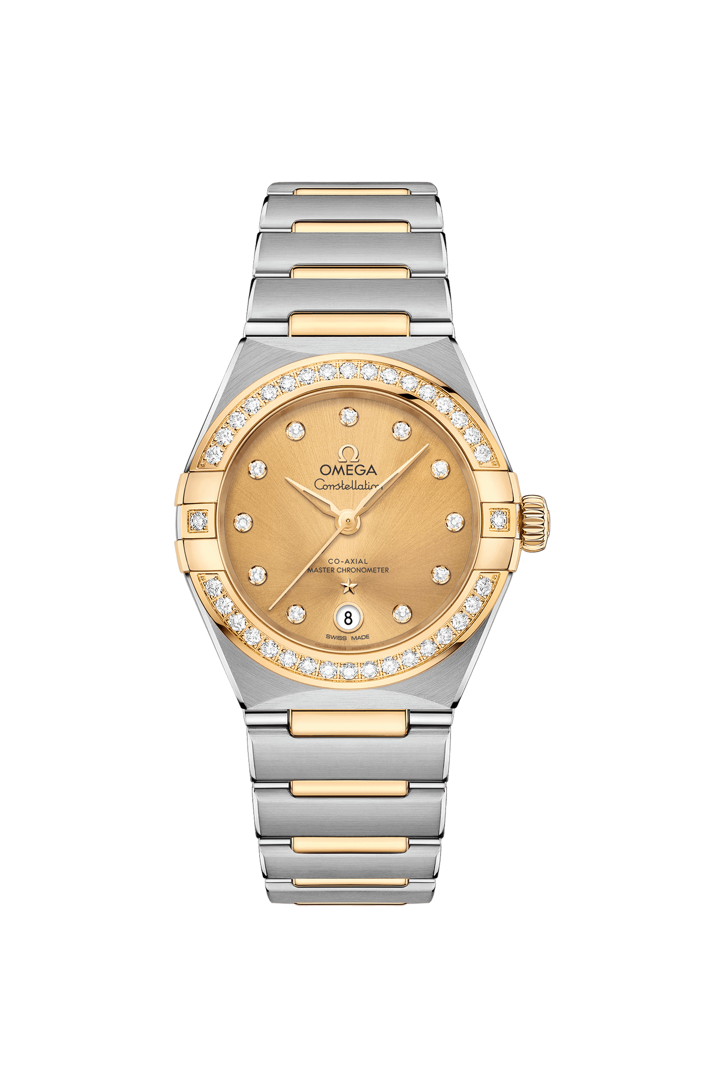この29mmの18Kイエローゴールドとステンレススティール製のモデルは、ダイヤモンドに彩られたベゼルが印象的で、サンブラッシュ仕上げのシャンパンゴールドダイアルには、ダイヤモンドのインデックスと、6時位置に日付窓があります。針、オメガロゴ、コンステレーションの「星」、ダイヤモンドインデックスのベゼルにも18Kイエローゴールドが使用されています。