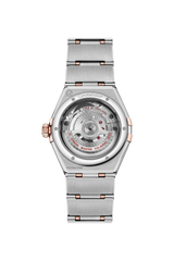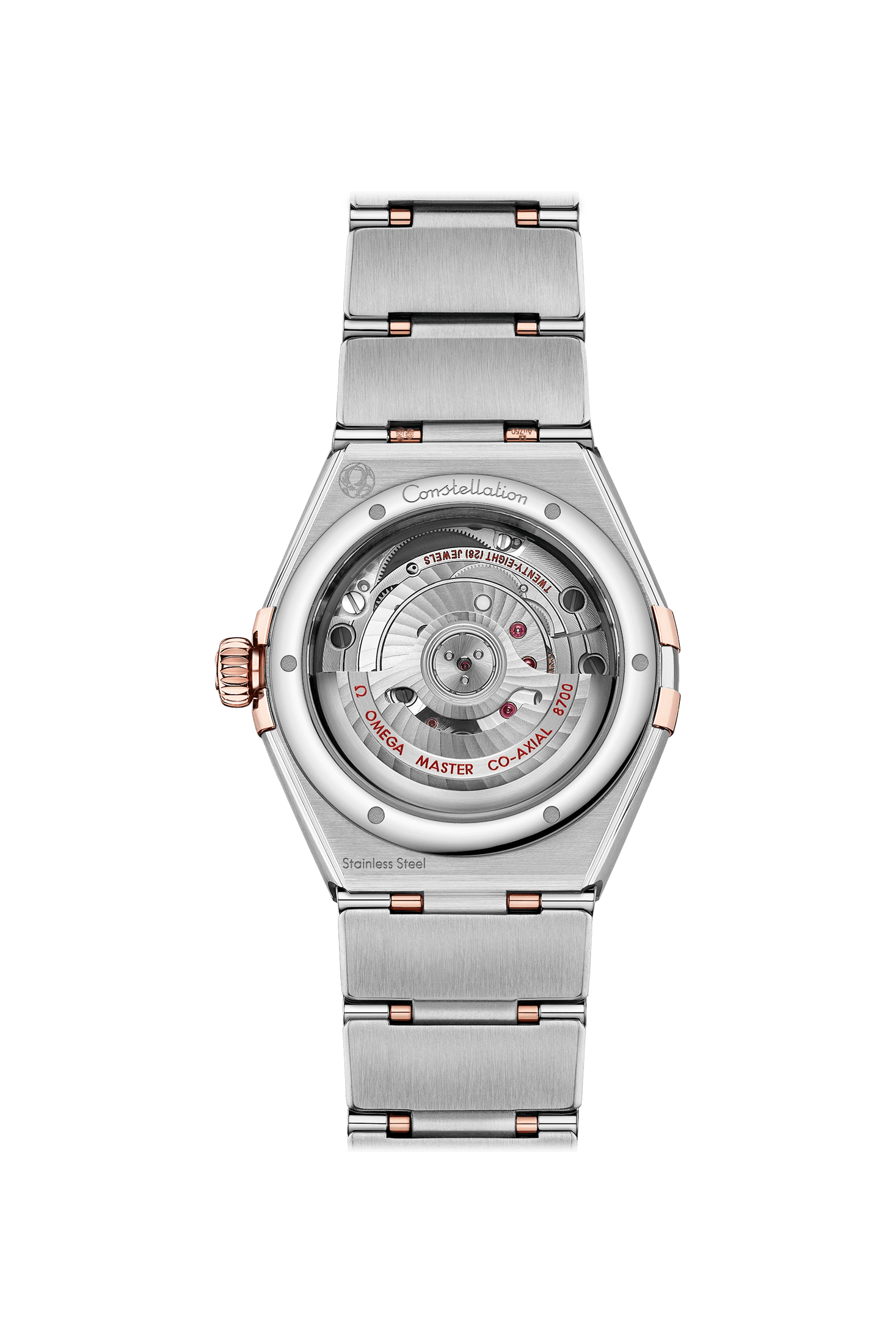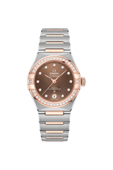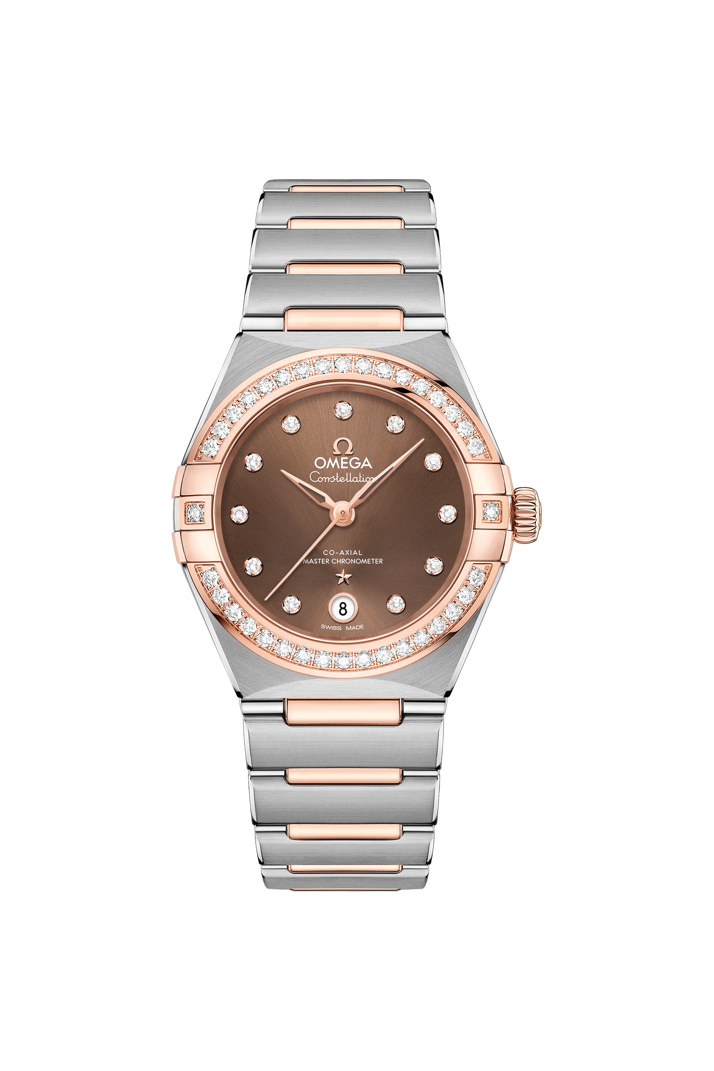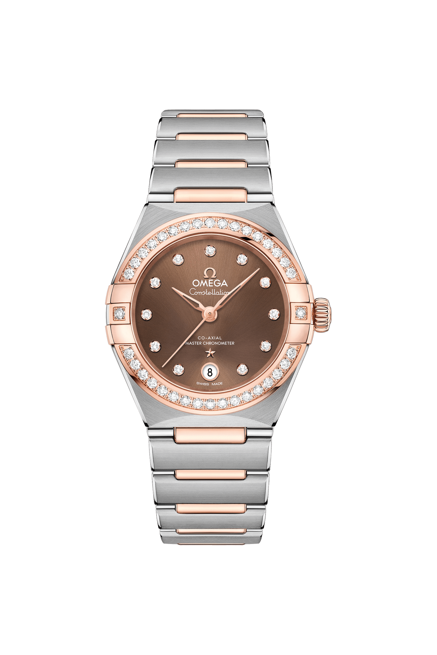 この29mmの18Kセドナ™ ゴールドとステンレススティール製のモデルは、ダイヤモンドに彩られたベゼルが印象的で、サンブラッシュ仕上げのブラウンのダイアルには、ダイヤモンドのインデックスと、6時位置に日付窓があります。針、オメガロゴ、コンステレーションの「星」、ダイヤモンドインデックスのベゼルにも18Kセドナ™ ゴールドが使用されています。