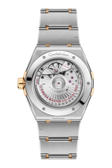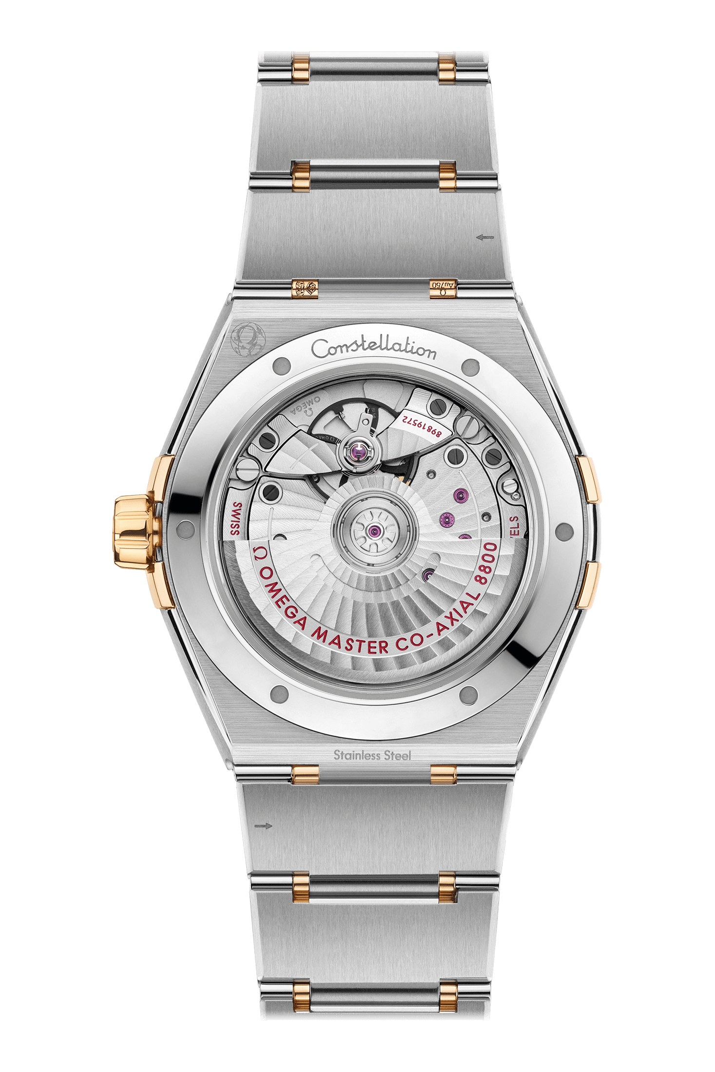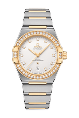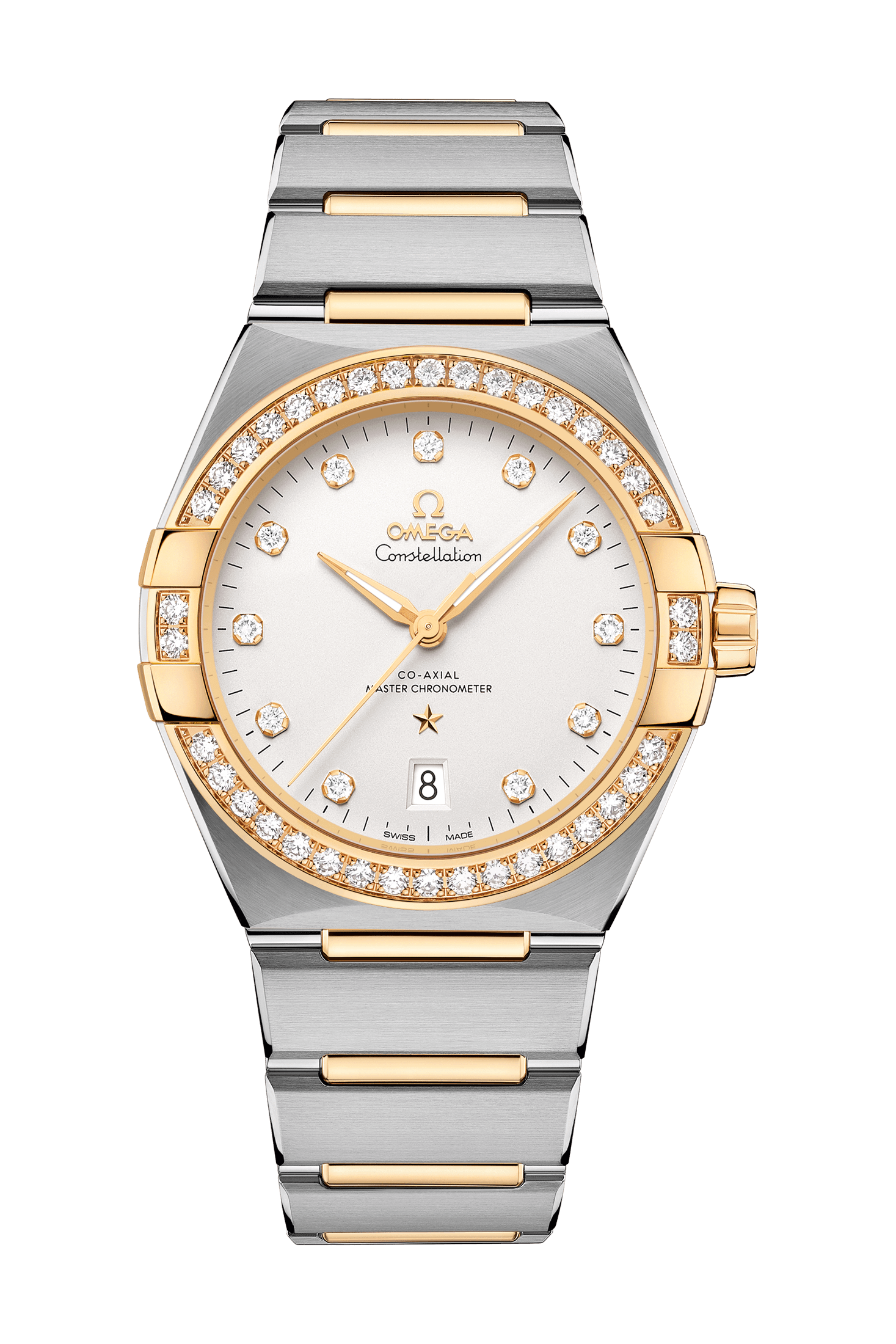 この39 mmのステンレススティールと18Kイエローゴールド製モデルは、ダイヤモンドに彩られたベゼルが印象的で、オパリンシルバーダイアルには、ダイヤモンドのインデックスと、6時位置に日付窓があります。針、オメガロゴ、コンステレーションの「星」、ダイヤモンドインデックスのベゼルには、いずれも18Kイエローゴールドが使用されています。