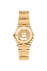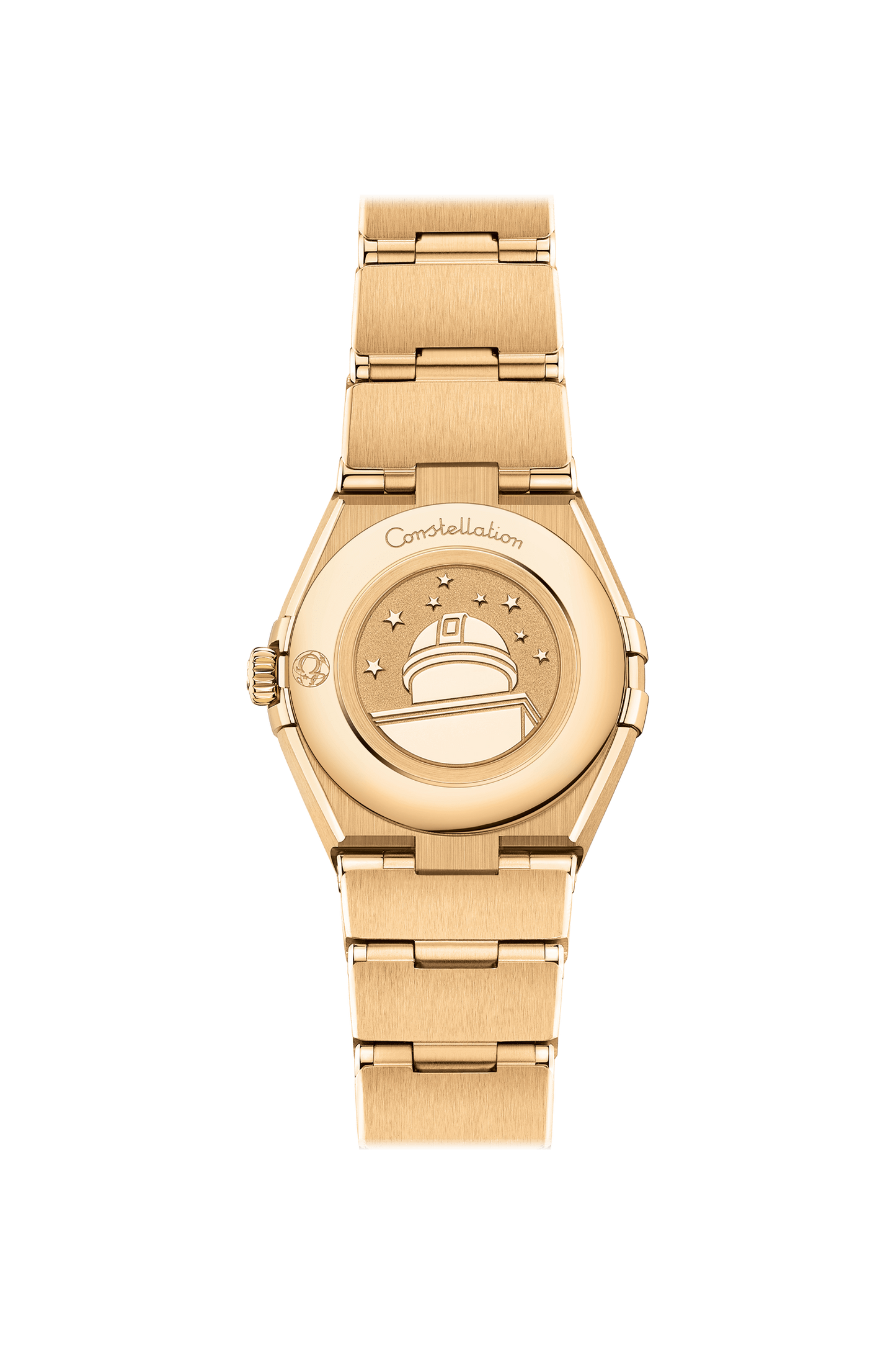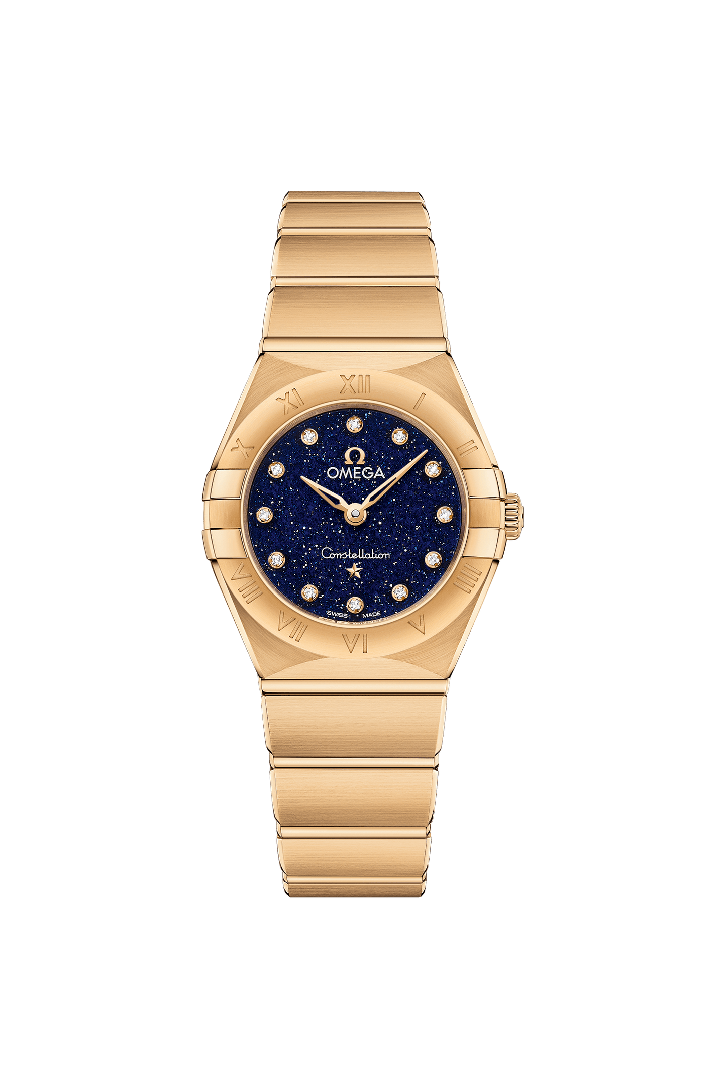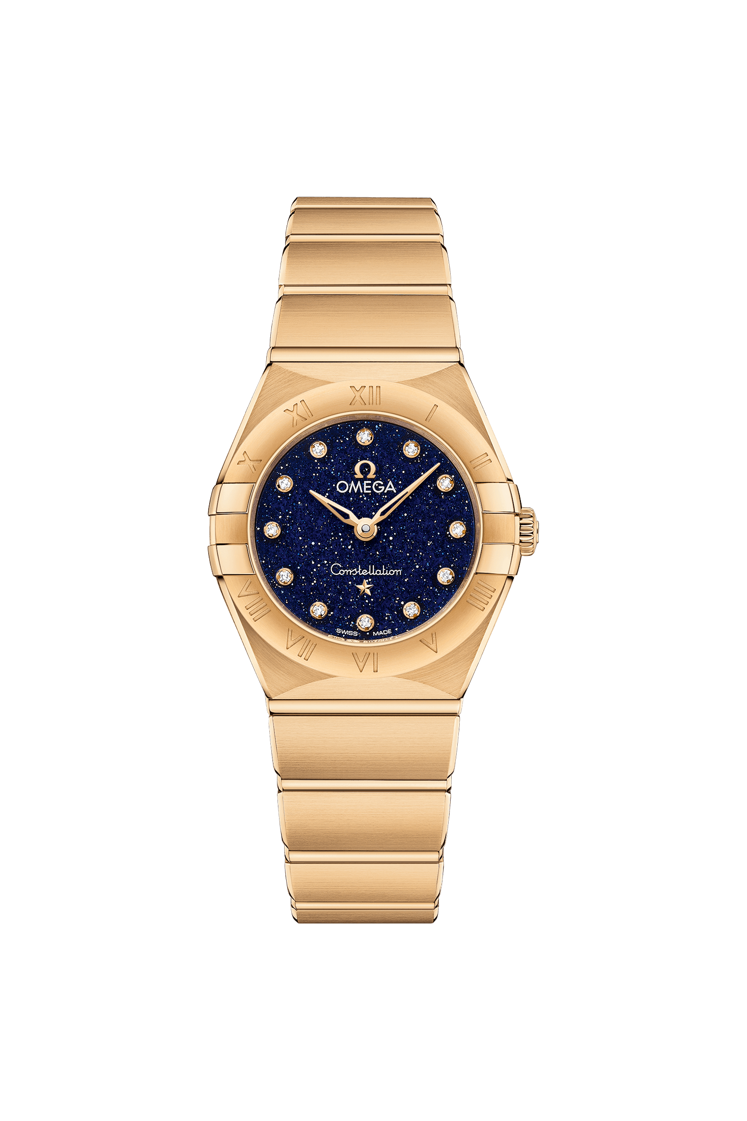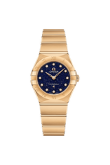 この直径25㎜の18Kイエローゴールド製モデルは、ローマ数字が刻印されたベゼルが印象的で、ブルーアベンチュリンガラス製のダイアルには、ダイヤモンドのインデックスが配されています。ブレスレット、針、オメガロゴ、コンステレーションの「星」、ダイヤモンドインデックスのベゼルにも18Kイエローゴールドが使用されています。