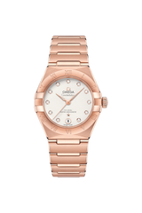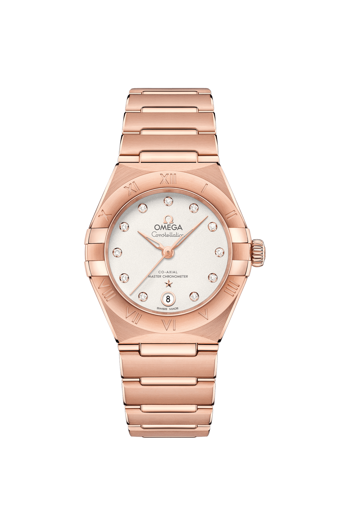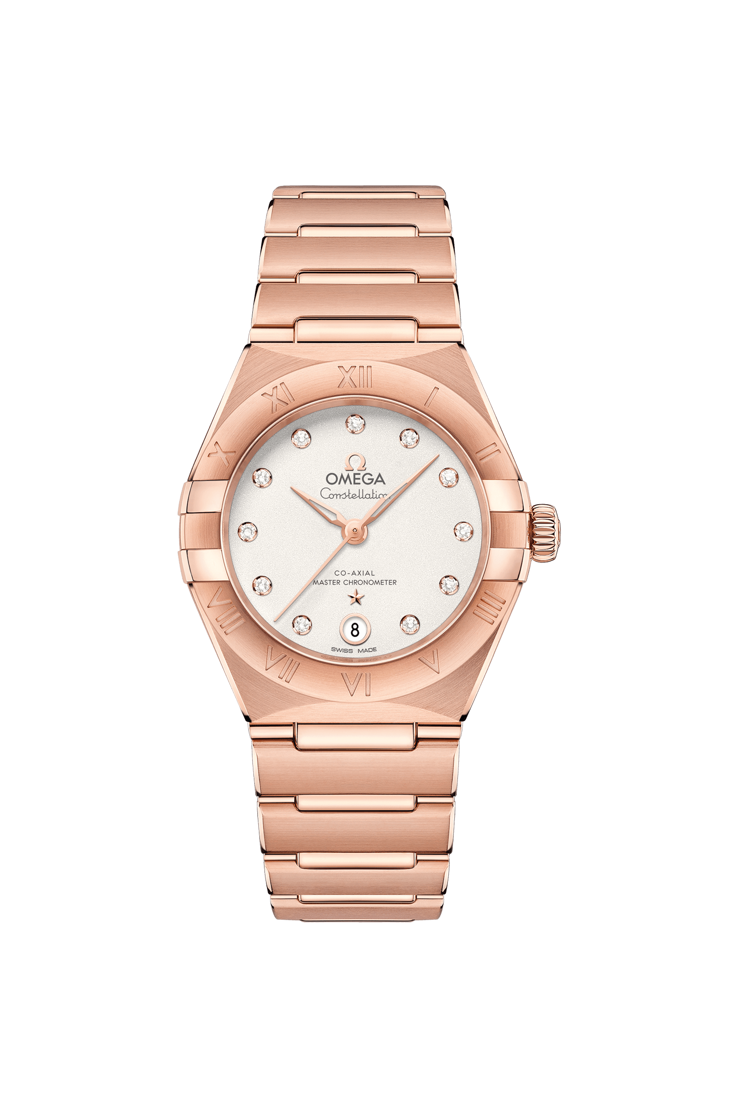 この29mmの18Kセドナ™ ゴールド製モデルは、ローマ数字が刻印されたベゼルが印象的で、クリスタルホワイトシルバーダイアルには、ダイヤモンドのインデックスと、6時位置に日付窓があります。ブレスレット、針、オメガロゴ、コンステレーションの「星」、ダイヤモンドインデックスのベゼルにも18Kセドナ™ ゴールドが使用されています。