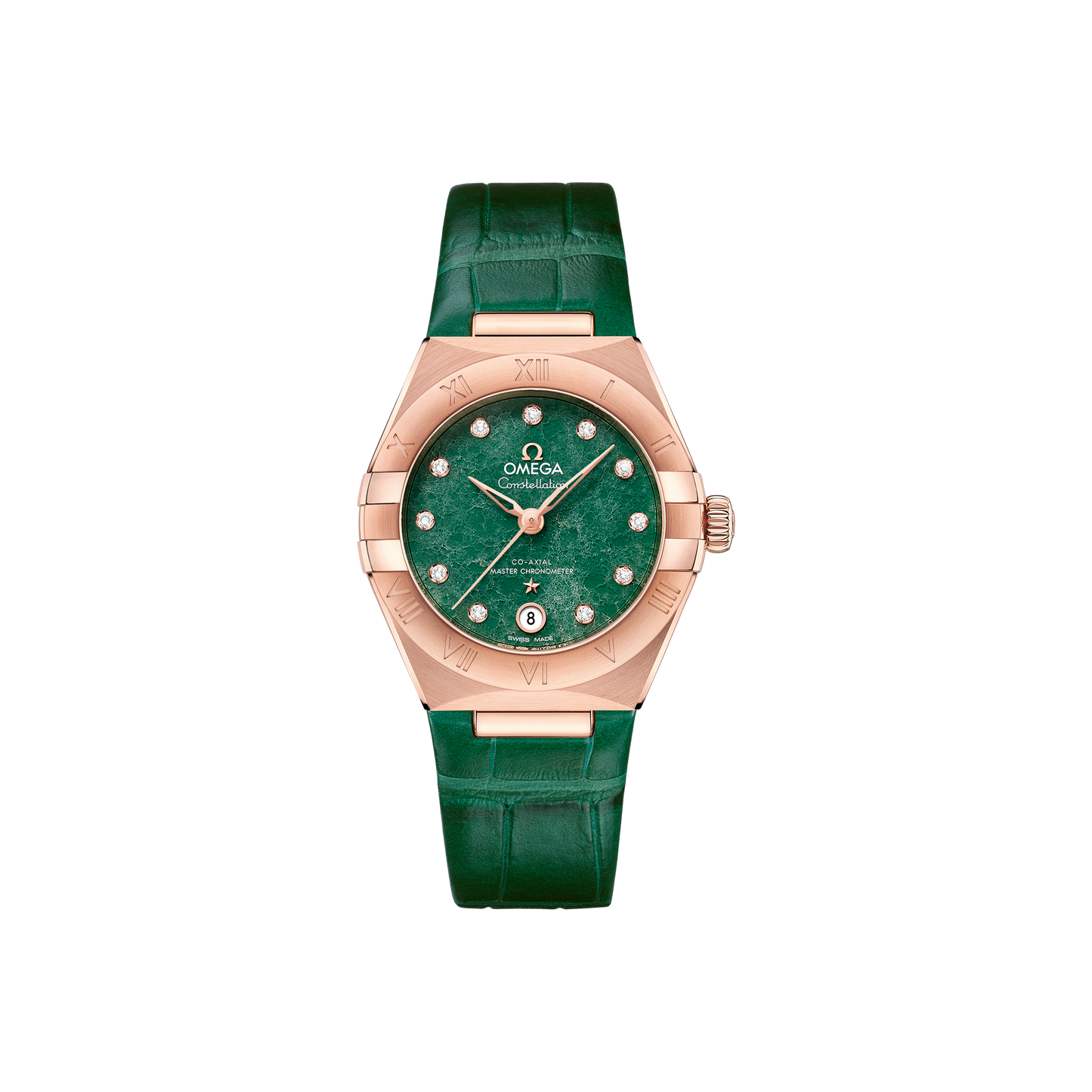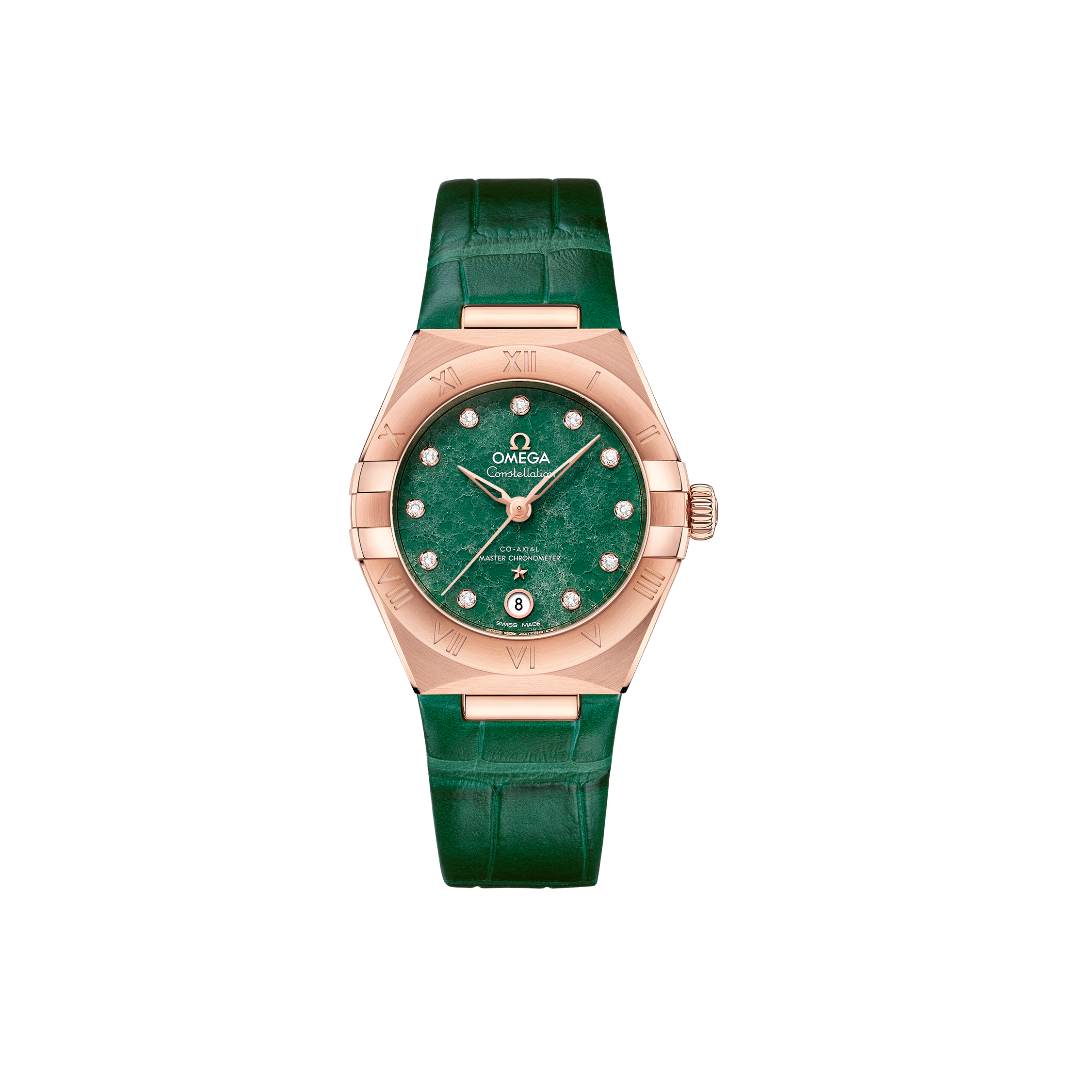 18Kセドナ™ゴールド製モデルは、ローマ数字が刻印されたベゼルと、6時位置の日付窓を備えます。針、インデックス、オメガロゴ、そしてコンステレーションの「星」にも18Kセドナ™ゴールドが使用されています。