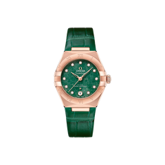 29mmサイズのこのモデルの特徴は、天然石のグリーンアヴェンチュリンで作られた文字盤と、そのカラーにマッチした光沢のあるレザーストラップです。
