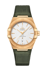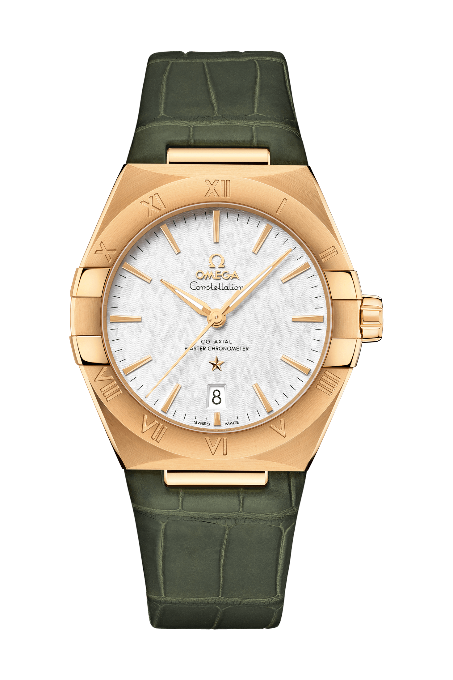 この39 mmの18Kイエローゴールド製モデルは、ローマ数字が刻印されたベゼルが印象的で、シルクエンボス加工のホワイトシルバーダイアルには、6時位置に日付窓があります。針、オメガロゴ、コンステレーションの「星」、インデックスにはいずれも18Kイエローゴールドが使用されています。