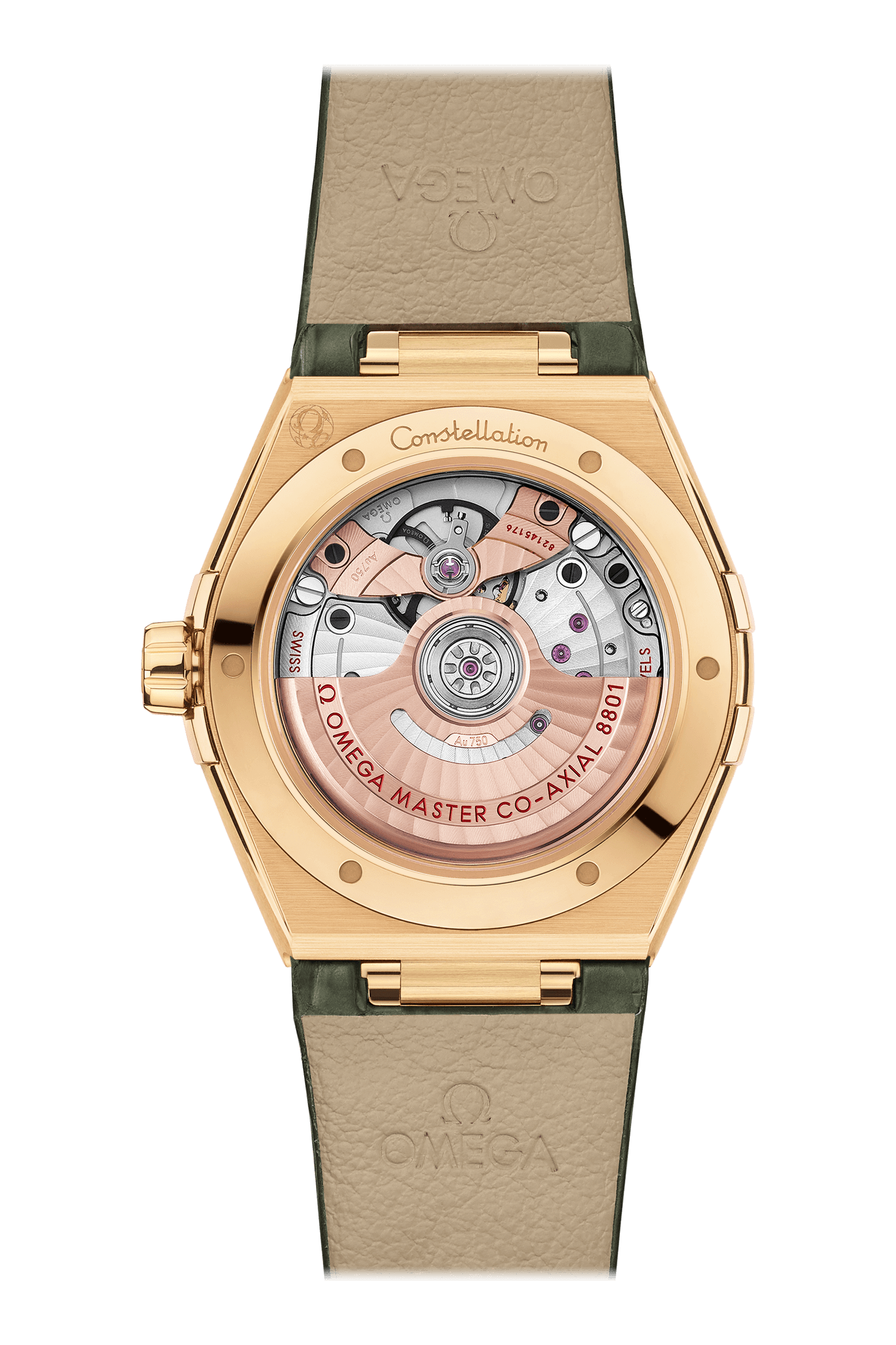 オリーブのレザーストラップが付属したこちらのタイムピースには、オメガ コーアクシャル マスター クロノメーター キャリバー 8801が搭載されており、傷のつきにくいドーム型サファイアクリスタルガラスから眺めることができます。