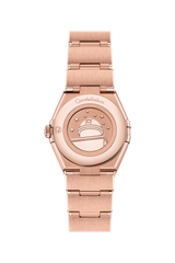 この28mmのジュエリーモデルでは、ケースのほか、控えめなローマ数字とスノーセッティングで敷き詰められた154石のダイヤモンドを配したベゼルに18Kセドナ™ ゴールドが使用されています。ホワイトオパールのダイアルには、スケルトンのリーフ型針とマンハッタンにそびえ立つ摩天楼からインスピレーションを得たバゲットカットのレッドルビーが配されています。