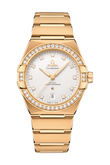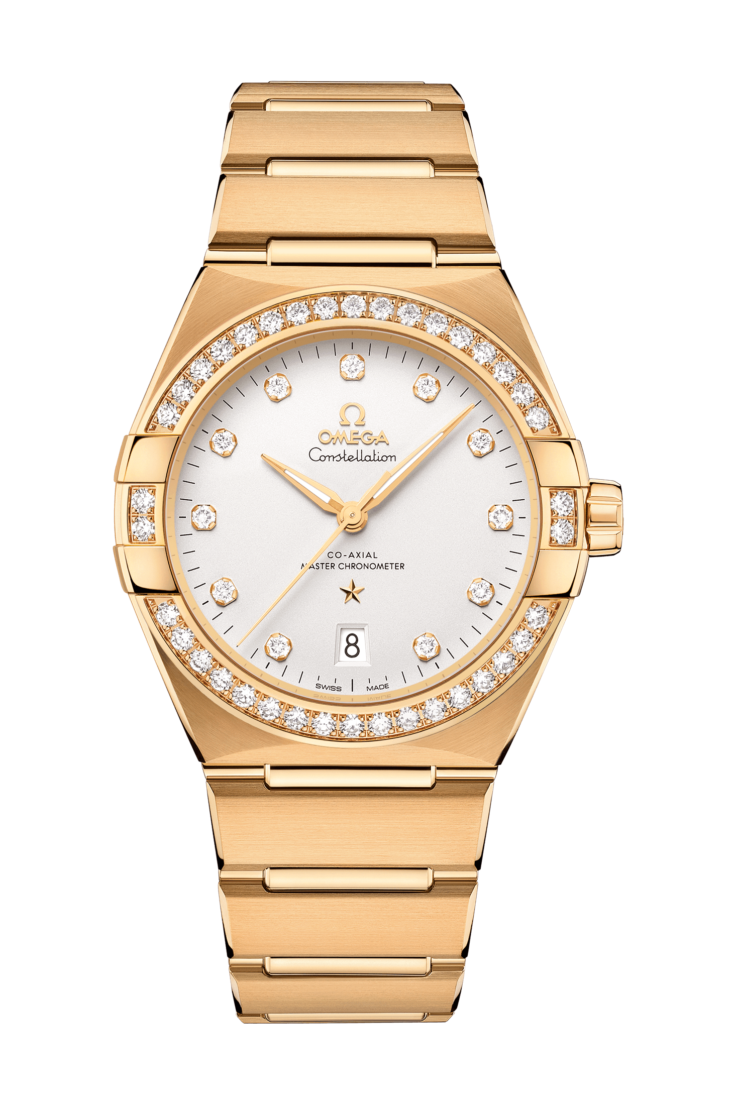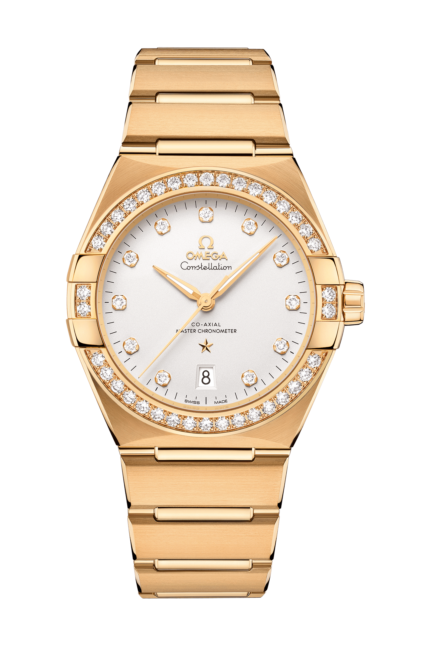 この39 mmの18Kイエローゴールド製モデルは、ダイヤモンドに彩られたベゼルが印象的で、オパリンシルバーダイアルには、ダイヤモンドのインデックスと、6時位置に日付窓があります。針、オメガロゴ、コンステレーションの「星」、ダイヤモンドインデックスのベゼルには、いずれも18Kイエローゴールドが使用されています。