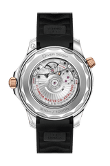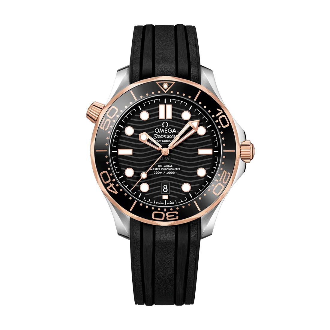 この42mmモデルは、ステンレススティールおよび18Kセドナ ゴールド製で、ブラックセラミック製ベゼルにはセラゴールド 技術によるダイビングスケールが付属しています。ダイアルもポリッシュ仕上げのブラックセラミック製で、レーザーエングレービングによる波模様と6時位置の日付表示が特徴です。