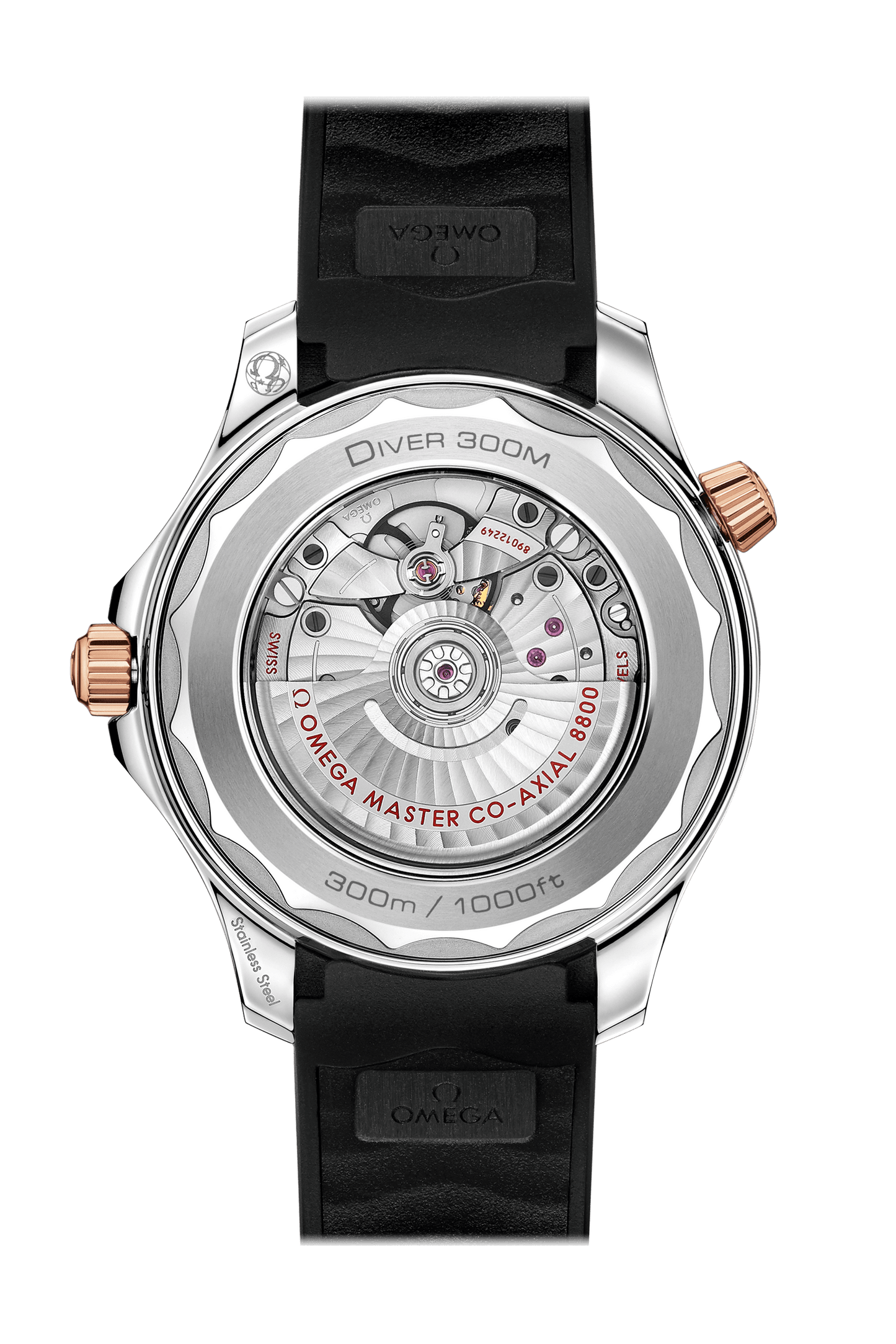 ブラックラバー製のストラップが付属。オメガ マスター クロノメーター キャリバー 8800が搭載され、波模様で縁取られたサファイア・クリスタルのケースバックから眺めることができます。