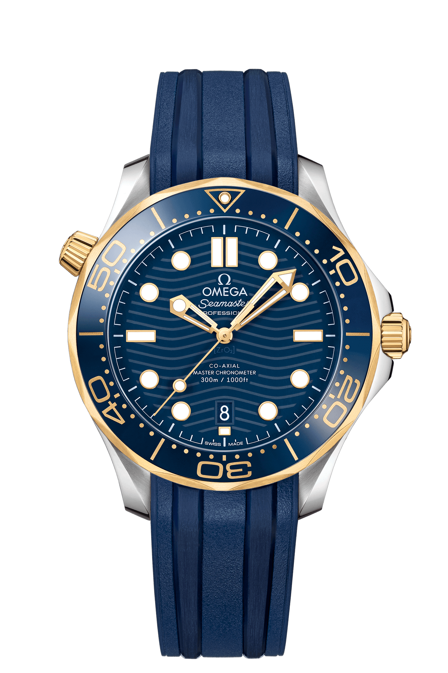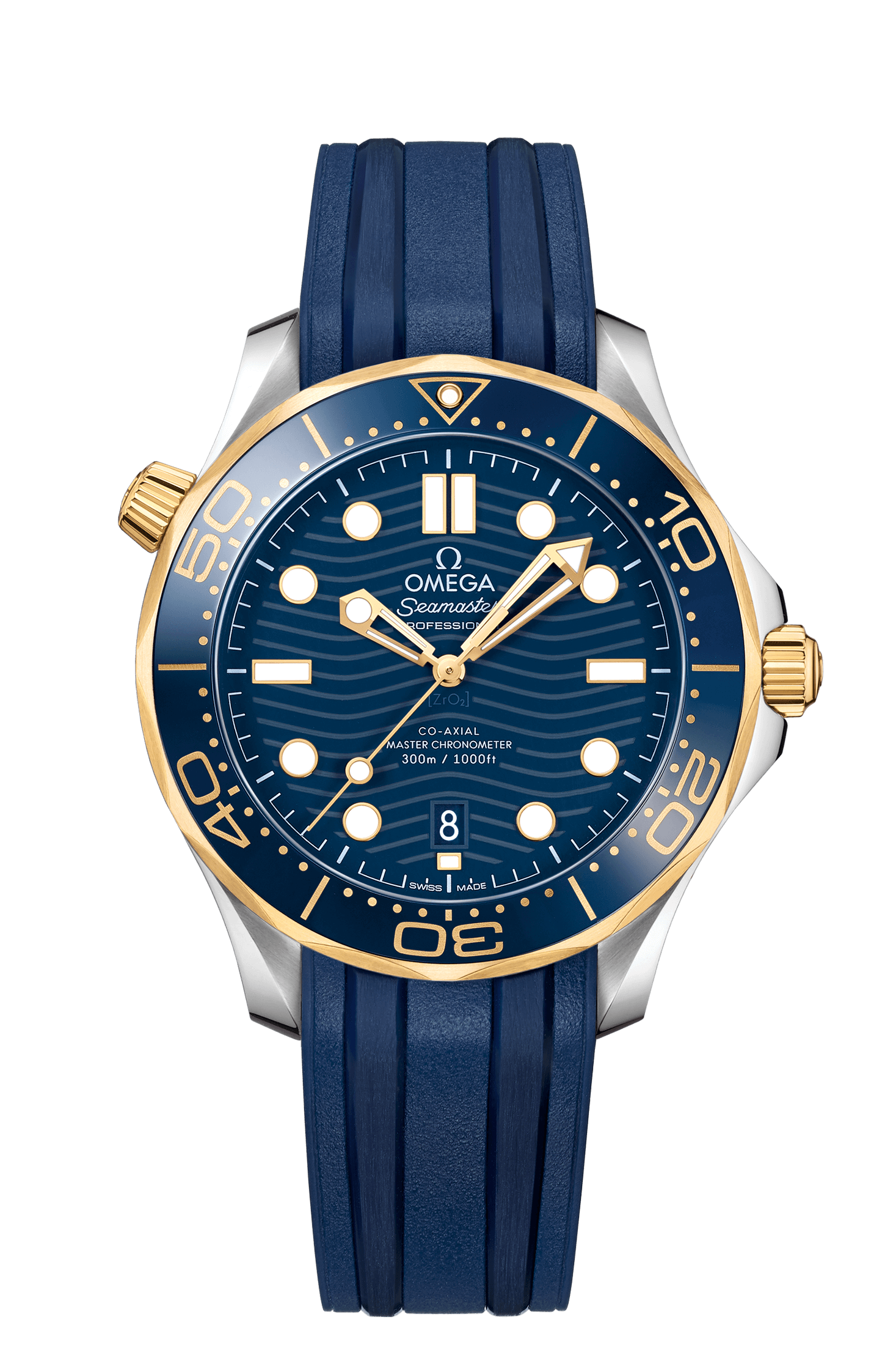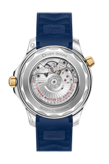 この42mmモデルは、ステンレススティールおよび18Kイエローゴールド製で、ブルーセラミック製ベゼルにはセラゴールド 技術によるダイビングスケールが付属しています。ダイアルもポリッシュ仕上げのブルーセラミック製で、レーザーエングレービングによる波模様と6時位置の日付表示が特徴です。