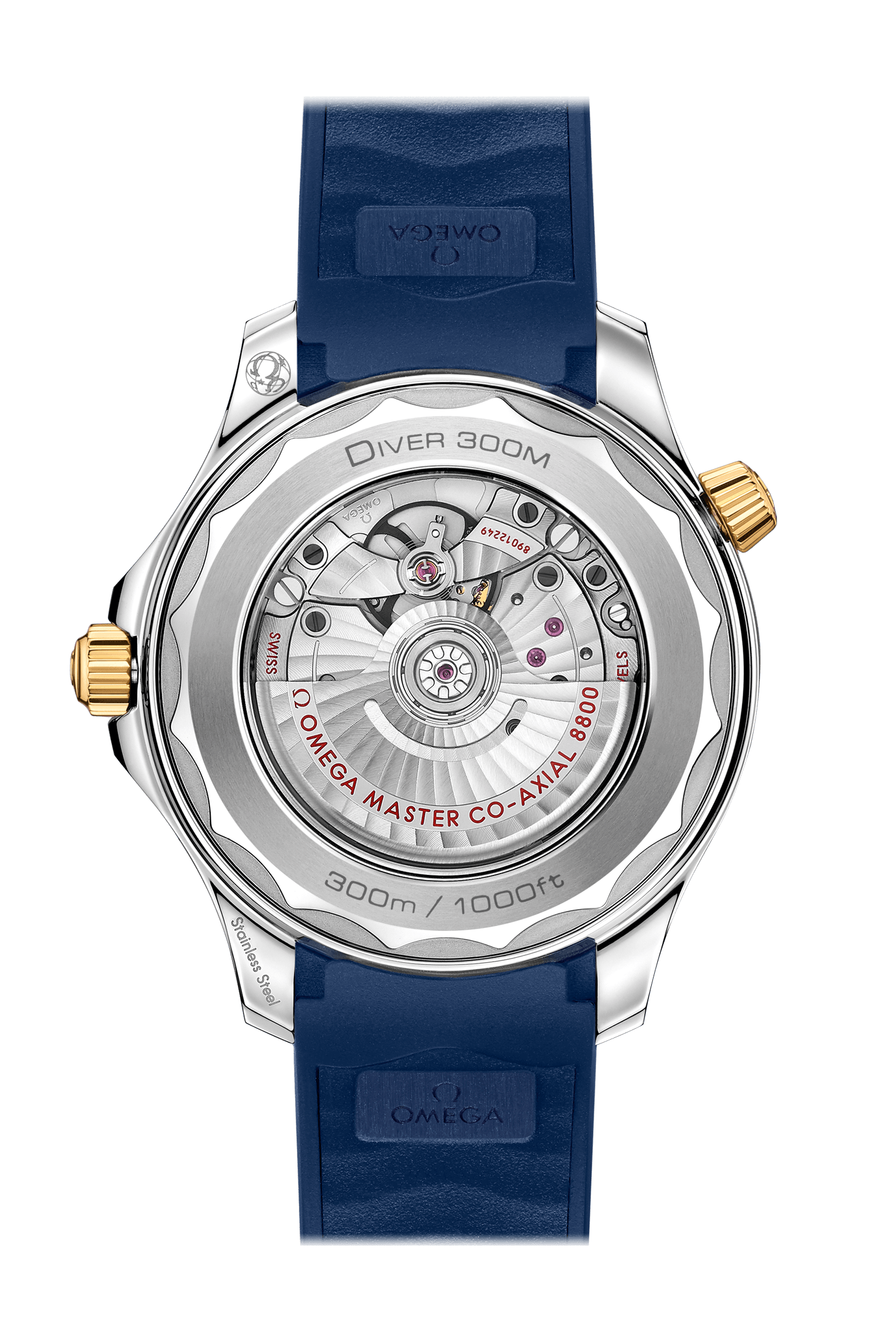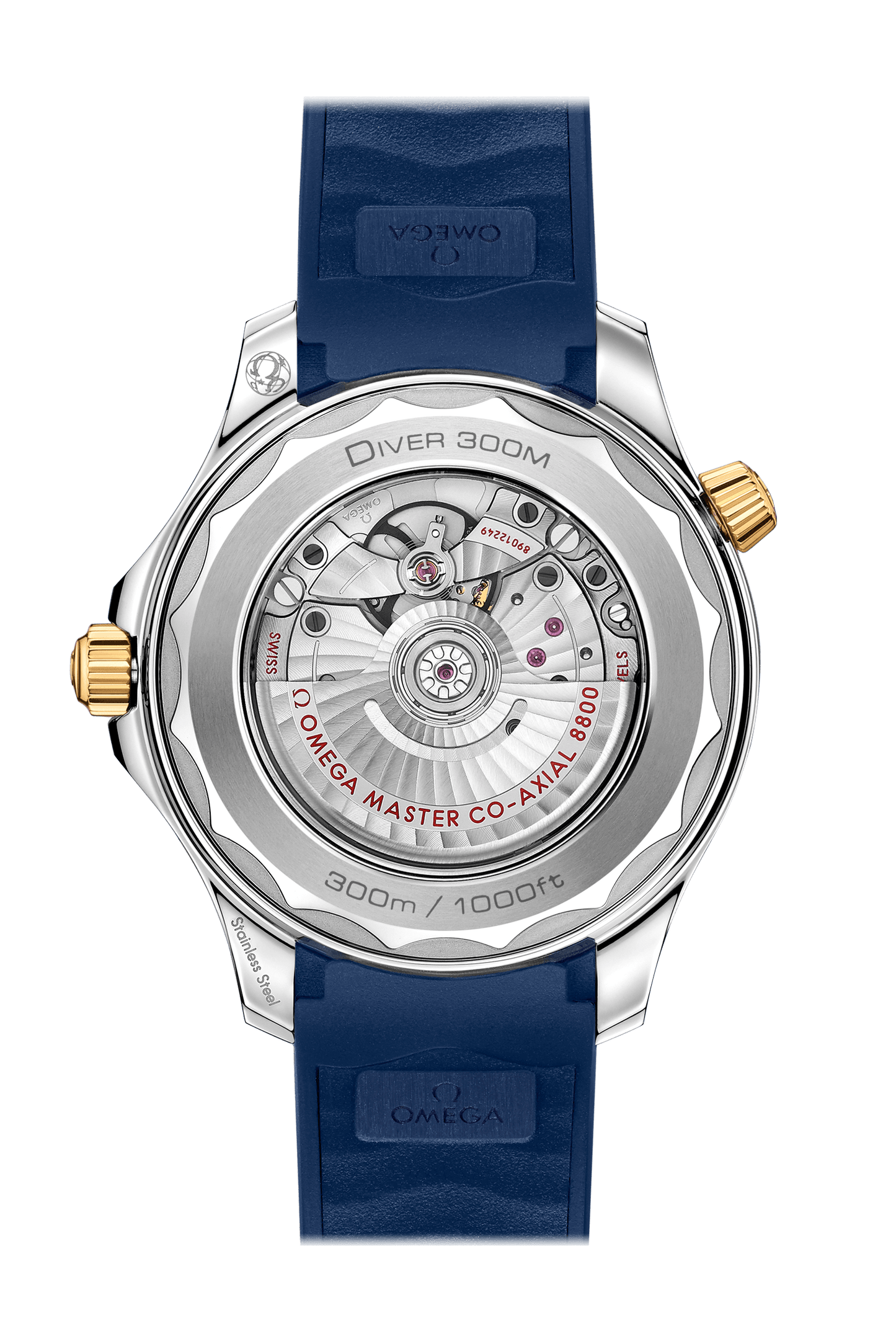 ブルーラバー製のストラップが付属。オメガ マスター クロノメーター キャリバー 8800が搭載され、波模様で縁取られたサファイア・クリスタルのケースバックから眺めることができます。