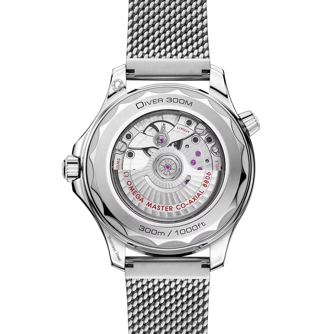 合わせられているのは、クラスプが付いたメッシュブレスレットです。オメガ コーアクシャル マスター クロノメーター キャリバー 8806搭載。サファイアクリスタルガラスのケースバックからその姿を眺めることができます。