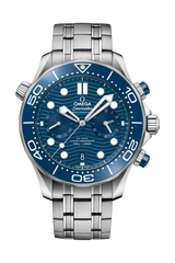 この44 mmのクロノグラフモデルはステンレススティール製で、ポリッシュ仕上げのブルーセラミックベゼルにはホワイトエナメルのダイビングスケールが付いています。プッシャーにもポリッシュ仕上げのブルーセラミックが採用されているほか、同素材のダイアルにはレーザーエングレービングで波模様があしらわれ、6時位置に日付表示が配されています。