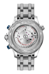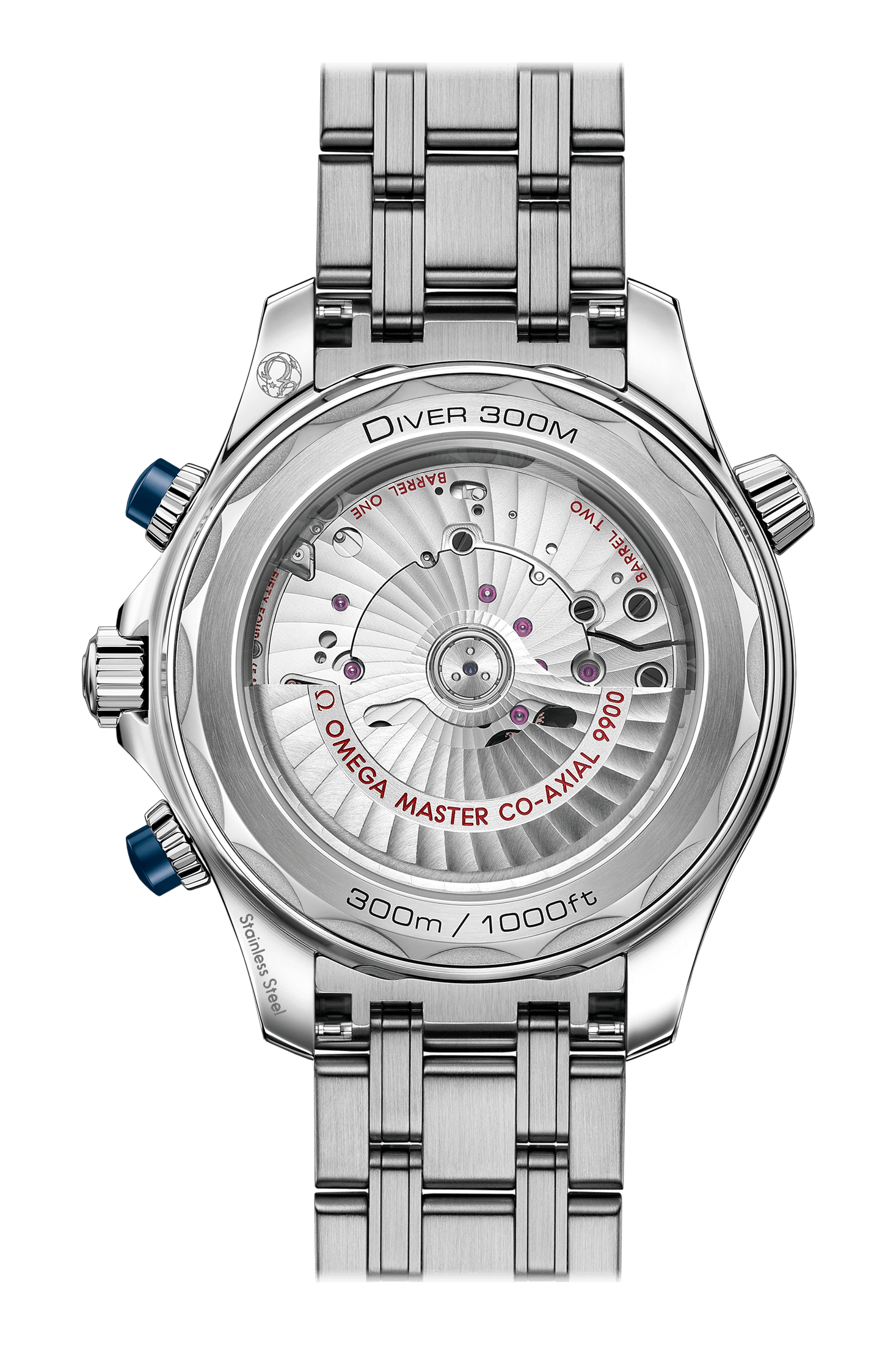 ブレスレットはステンレススティール製です。オメガ マスター クロノメーター キャリバー 9900が搭載され、波模様で縁取られたサファイアクリスタルガラスのケースバックから眺めることができます。