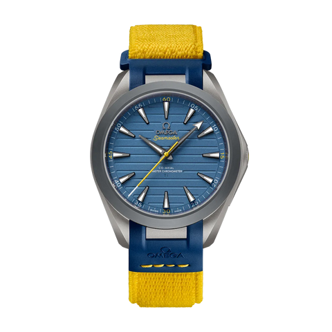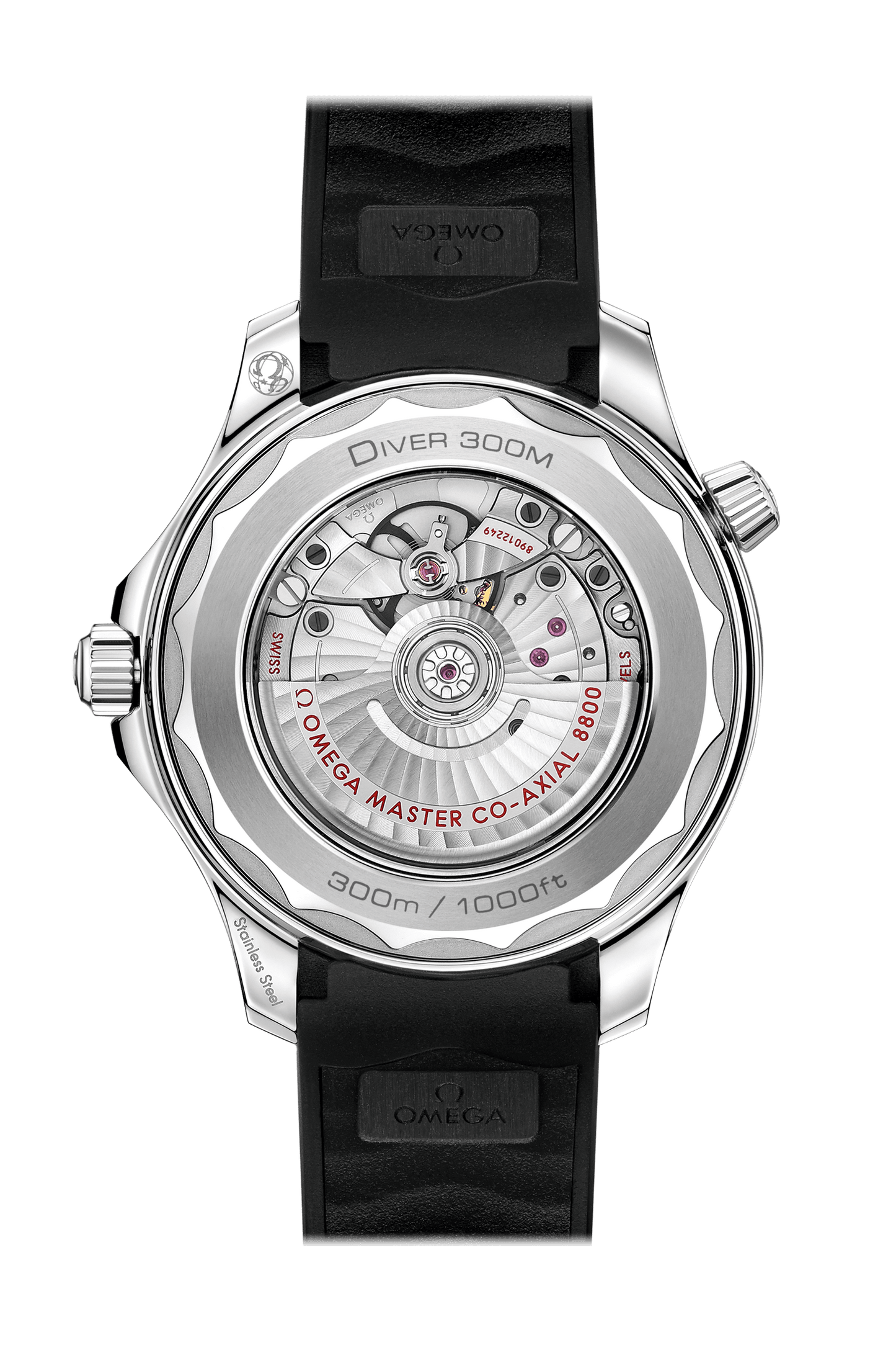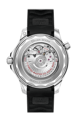 ブレスレットは一体型のブラックラバー製のストラップが付属。オメガ マスター クロノメーター キャリバー8800が搭載され、波模様で縁取られたサファイアクリスタルのケースバックから眺めることができます。